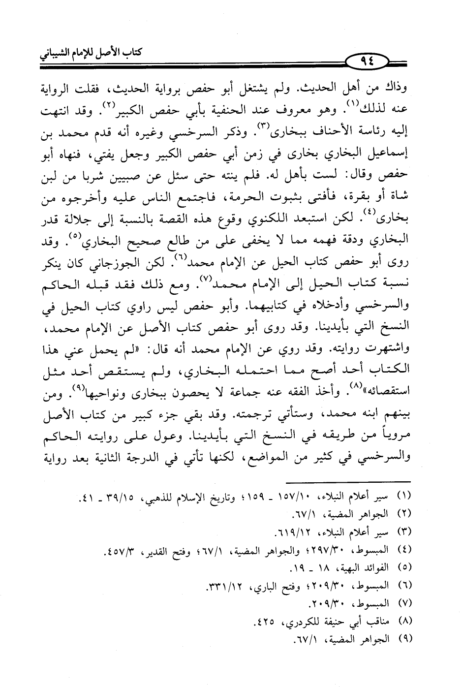 وذاك من أهل الحديث. ولم يشتغل أبو حفص برواية الحديث، فقلت الرواية عنه لذلك (¬1). وهو معروف عند الحنفية بأبي حفص الكبير (¬2). وقد انتهت إليه رئاسة الأحناف ببخارى (¬3). وذكر السرخسي وغيره أنه قدم محمد بن إسماعيل البخاري بخارى في زمن أبي حفص الكبير وجعل يفتي، فنهاه أبو حفص وقال: لست بأهل له. فلم ينته حتى سئل عن صبيين شربا من لبن شاة أو بقرة، فأفتي بثبوت الحرمة، فاجتمع الناس عليه وأخرجوه من بخارى (¬4). لكن استبعد اللكنوي وقوع هذه القصة بالنسبة إلى جلالة قدر البخاري ودقة فهمه مما لا يخفى على من طالع صحيح البخاري (¬5). وقد روى أبو حفص كتاب الحيل عن الإمام محمد (¬6). لكن الجوزجاني كان ينكر نسبة كتاب الحيل إلى الإمام محمد (¬7). ومع ذلك فقد قبله الحاكم والسرخسي وأدخلاه في كتابيهما. وأبو حفص ليس راوي كتاب الحيل في النسخ التي بأيدينا. وقد روى أبو حفص كتاب الأصل عن الإمام محمد، واشتهرت روايته. وقد روي عن الإمام محمد أنه قال: "لم يحمل عني هذا الكتاب أحد أصح مما احتمله البخاري، ولم يستقص أحد مثل استقصائه" (¬8). وأخذ الفقه عنه جماعة لا يحصون ببخارى ونواحيها (¬9). ومن بينهم ابن محمد، وستأتي ترجمته. وقد بقي جزء كبير من كتاب الأصل مروياً من طريقه في النسخ التي بأيدينا. وعول على روايته الحاكم والسرخسي في كثير من المواضع، لكنها تأتي في الدرجة الثانية بعد رواية