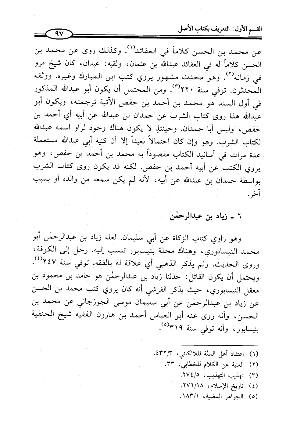وهو راوي كتاب الزكاة عن أبي سليمان. لعله زياد بن عبدالرحمن أبو محمد النيسابوري، وهناك محلة بنيسابور تنسب إليه. رحل إلى الكوفة، وروى الحديث. ولم يذكر الذهبي أي علاقة له بالفقه. توفي سنة 247 (¬4). ويحتمل أن يكون القائل: حدثنا زياد بن عبد الرحمن هو حامد بن محمود بن معقل النيسابوري، حيث يذكر القرشي أنه كان يروي كتب محمد بن الحسن عن زياد بن عبد الرحمن عن أبي سليمان موسى الجوزجاني عن محمد بن الحسن، وأنه روى عنه أبو العباس أحمد بن هارون الفقيه شيخ الحنفية بنيسابور، وأنه توفي سنة 319 (¬5).