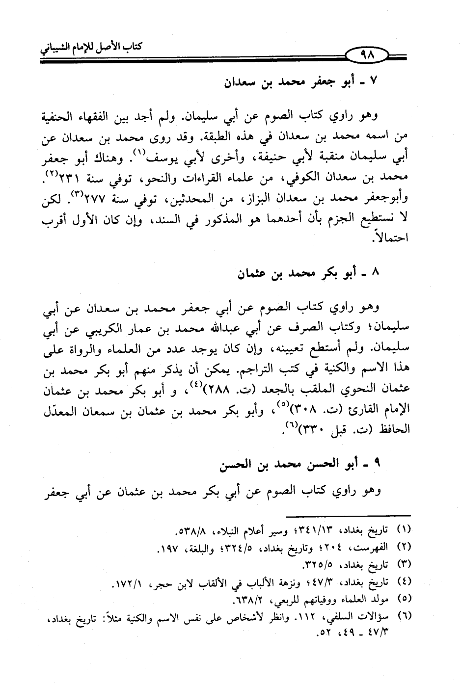 وهو راوي كتاب الصوم عن أبي سليمان. ولم أجد بين الفقهاء الحنفية من اسمه محمد بن سعدان في هذه الطبقة. وقد روى محمد بن سعدان عن أبي سليمان منقبة لأبي حنيفة، وأخرى لأبي يوسف (¬1). وهناك أبو جعفر محمد بن سعدان الكوفي، من علماء القراءات والنحو، توفي سنة 231 (¬2). وأبو جعفر محمد بن سعدان البزاز، من المحدثين، توفي سنة 277 (¬3). لكن لا نستطيع الجزم بأن أحدهما هو المذكور في السند، وإن كان الأول أقرب احتمالاً.