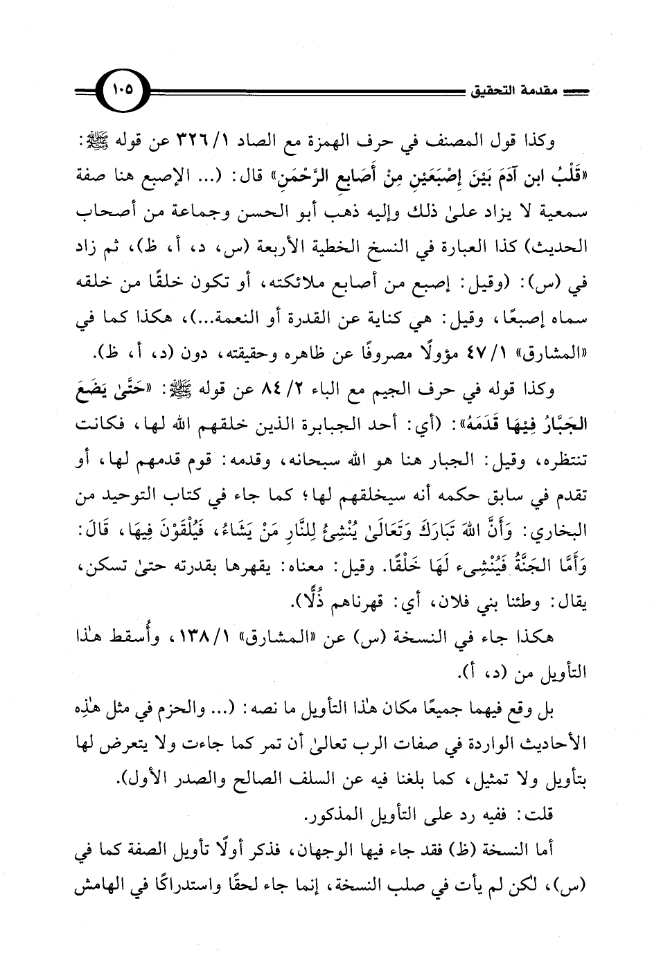 وكذا قول المصنف في حرف الهمزة مع الصاد 1/ 326 عن قوله - صلى الله عليه وسلم -: "قَلْبُ ابن آدَمَ بَينَ إِصْبَعَينِ مِنْ أَصَابع الرَّحْمَنِ" قال: (... الإِصبع هنا صفة سمعية لا يزاد على ذلك وإليه ذهب أبو الحسن وجماعة من أصحاب الحديث) كذا العبارة في النسخ الخطية الأربعة (س، د، أ، ظ)، ثم زاد في (س): (وقيل: إصبع من أصابع ملائكته، أو تكون خلقًا من خلقه سماه إصبعًا، وقيل: هي كناية عن القدرة أو النعمة ...)، هكذا كما في "المشارق" 1/ 47 مؤولًا مصروفاً عن ظاهره وحقيقته، دون (د، أ، ظ).