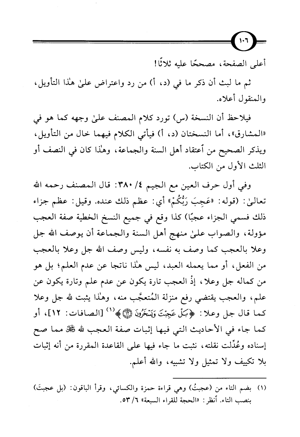 وفي أول حرف العين مع الجيم 4/ 380: قال المصنف رحمه الله تعالى: (قوله: "عَجِبَ رَبُّكُمْ" أي: عظم ذلك عنده. وقيل: عظم جزاء ذلك فسمي الجزاء عجبًا) كذا وقع في جميع النسخ الخطية صفة العجب مؤولة، والصواب على منهج أهل السنة والجماعة أن يوصف الله جل وعلا بالعجب كما وصف به نفسه، وليمس وصف الله جل وعلا بالعجب من الفعل، أو مما يعمله العبد، ليمس هذا ناتجا عن عدم العلم؛ بل هو من كماله جل وعلا، إذْ العجب تارة يكون عن عدم علم وتارة يكون عن علم، والعجب يقتضي رفع منزلة المُتعجّب منه، وهذا يثبت لله جل وعلا كما قال جل وعلا: {بَلْ عَجِبْتَ وَيَسْخَرُونَ (12)} (¬1) [الصافات: 12]، أو كما جاء في الأحاديث التي فيها إثبات صفة العجب لله عزّ وجلّ مما صح إسناده وعُدِّلت نقلته، نثبت ما جاء فيها على القاعدة المقررة من أنه إثبات بلا تكييف ولا تمثيل ولا تشبيه، والله أعلم.