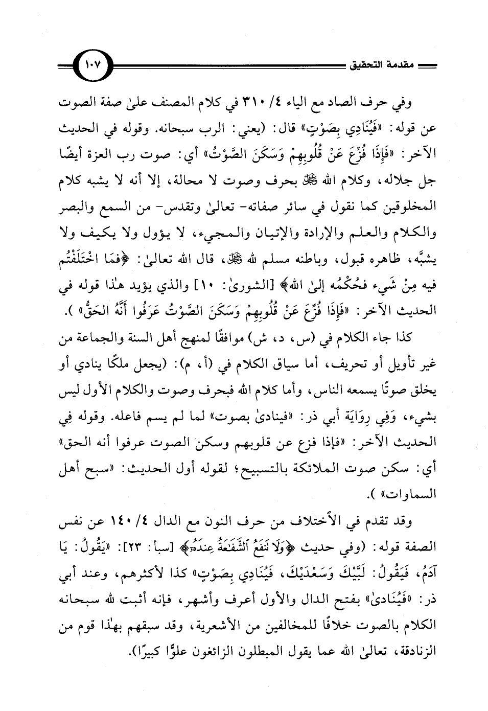 وفي حرف الصاد مع الياء 4/ 310 في كلام المصنف على صفة الصوت عن قوله: "فَيُنَادِي بِصَوْتٍ" قال: (يعني: الرب سبحانه. وقوله في الحديث الآخر: "فَإِذَا فُزِّعَ عَنْ قُلُوبِهِمْ وَسَكَنَ الصَّوْتُ" أي: صوت رب العزة أيضًا جل جلاله، وكلام الله -عزّ وجلّ - بحرف وصوت لا محالة، إلا أنه لا يشبه كلام المخلوقين كما نقول في سائر صفاته - تعالى وتقدس - من السمع والبصر والكلام والعلم والإرادة والإتيان والمجيء، لا يؤول ولا يكيف ولا يشبَّه، ظاهره قبول، وباطنه مسلم لله - عزّ وجلّ -، قال الله تعالى: {وَمَا اخْتَلَفْتُمْ فِيهِ مِنْ شَيْءٍ فَحُكْمُهُ إِلَى اللَّهِ} [الشورى: 10]، والذي يؤيد هذا قوله في الحديث الآخر: "فَإِذَا فُزِّعَ عَنْ قُلُوبِهِمْ وَسَكَنَ الصَّوْتُ عَرَفُوا أَنَّهُ الحَقُّ").