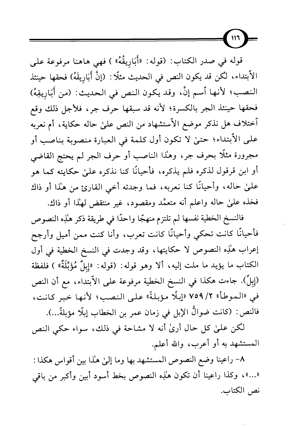 قوله في صدر الكتاب: (قوله: "أَبَارِيقُهُ") فهي ها هنا مرفوعة على الابتداء، لكن قد يكون النص في الحديث مثلًا: (إنَّ أَبَارِيقَهُ) فحقها حينئذ النصب؛ لأنها اسم إنَّ، وقد يكون النص في الحديث: (من أَبَارِيقِهُ) فحقها حينئذ الجر بالكسرة؛ لأنه قد سبقها حرف جر، فلأجل ذلك وقع اختلاف هل نذكر موضع الاستشهاد من النص على حاله حكايته، أم نعربه على الابتداء؛ حتى لا تكون أول كلمة في العبارة منصوبة بناصب أو مجرورة مثلًا بحرف جر، وهذا الناصب أو حرف الجر لم يحتج القاضي أو ابن قرقول لذكره فلم يذكره، فأحيانًا كنا نذكره على حكايته كما هو على حاله، وأحياناً كنا نعربه، فما وجدته أخي القارئ من هذا أو ذاك فخذه على حاله واعلم أنه متعمَّد ومقصود، غير منتقض لهذا أو ذاك. فالنسخ الخطية نفسها لم تلتزم منهجًا واحدًا في طريقة ذكر هذِه النصوص فأحيانًا كانت تحكي وأحيانًا كانت تعرب، وأنا كنت ممن أميل وأرجح إعراب هذِه النصوص لا حكايتها، وقد وجدت في النسخ الخطية في أول الكتاب ما يؤيد ما ملت إليه، ألا وهو قوله: (قوله: "إِبِلٌ مُؤبلَةٌ") فلفظة (إِبِلٌ). جاءت هكذا في النسخ الخطية مرفوعة على الابتداء، مع أن النص في "الموطأ" 2/ 759 "إبلًا مؤبلةً" على النصب؛ لأنها خبر كانت، فالنص: (كانت ضوالُّ الإبل في زمان عمر بن الخطاب إبلًا مؤبلةً ...). لكن على كل حال أرى أنه لا مشاحة في ذلك، سواء حكي النص المستشهد به أو أعرب، والله أعلم.