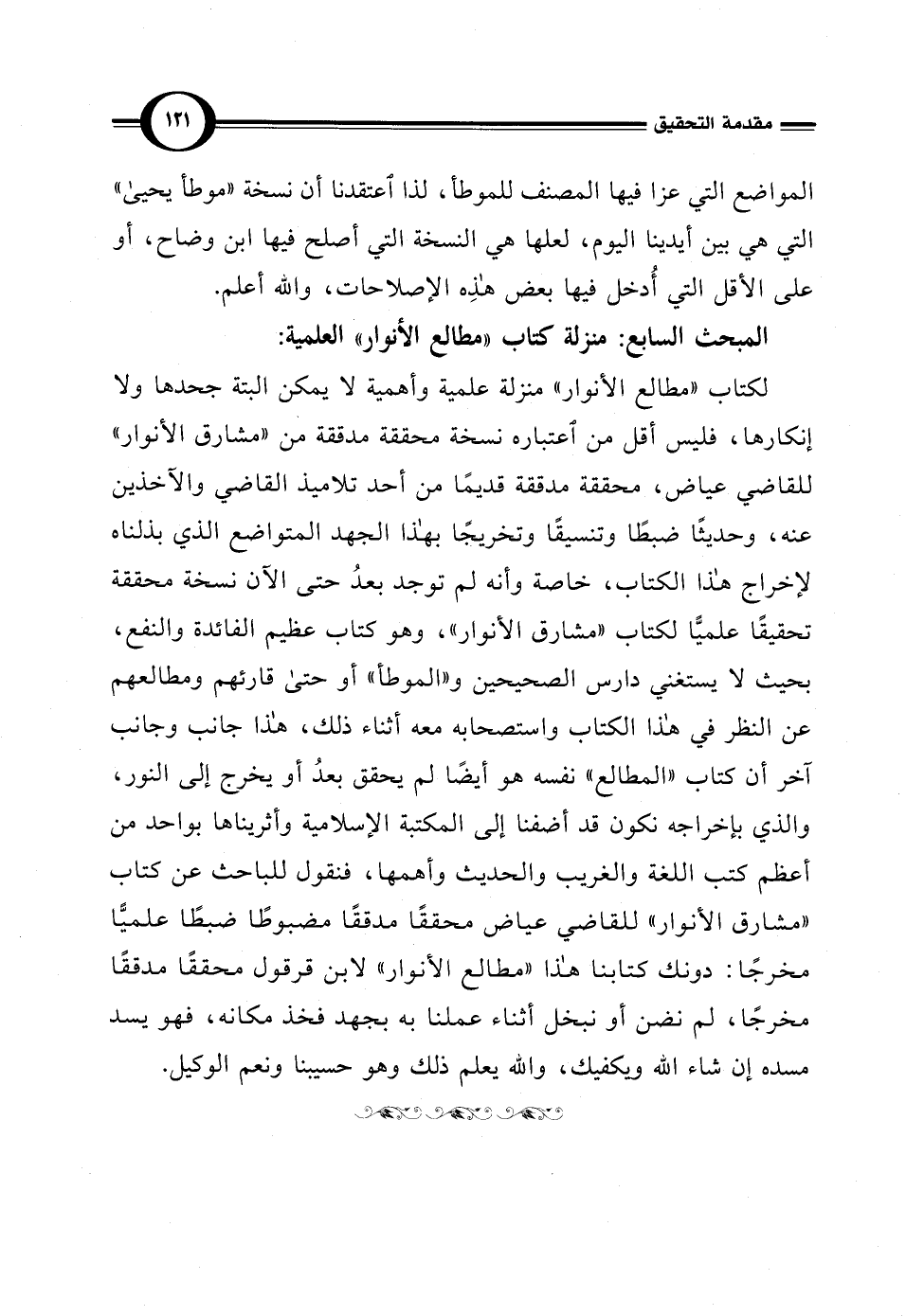لكتاب "مطالع الأنوار" منزلة علمية وأهمية لا يمكن البتة جحدها ولا إنكارها، فليس أقل من اعتباره نسخة محققة مدققة من "مشارق الأنوار" للقاضي عياض، محققة مدققة قديمًا من أحد تلاميذ القاضي والآخذين عنه، وحديثًا ضبطًا وتنسيقًا وتخريجًا بهذا الجهد المتواضع الذي بذلناه لإخراج هذا الكتاب، خاصة وأنه لم توجد بعدُ حتى الآن نسخة محققة تحقيقًا علميًّا لكتاب "مشارق الأنوار"، وهو كتاب عظيم الفائدة والنفع، بحيث لا يستغني دارس الصحيحين و"الموطأ" أو حتى قارئهم ومطالعهم عن النظر في هذا الكتاب واستصحابه معه أثناء ذلك، هذا جانب وجانب آخر أن كتاب "المطالع" نفسه هو أيضًا لم يحقق بعدُ أو يخرج إلى النور، والذي بإخراجه نكون قد أضفنا إلى المكتبة الإِسلامية وأثريناها بواحد من أعظم كتب اللغة والغريب والحديث وأهمها، فنقول للباحث عن كتاب "مشارق الأنوار" للقاضي عياض محققًا مدققًا مضبوطًا ضبطًا علميًّا مخرجًا: دونك كتابنا هذا "مطالع الأنوار" لابن قرقول محققًا مدققًا مخرجًا، لم نضن أونبخل أثناء عملنا به بجهد فخذ مكانه، فهو يسد مسده إن شاء الله ويكفيك، والله يعلم ذلك وهو حسيبنا ونعم الوكيل.