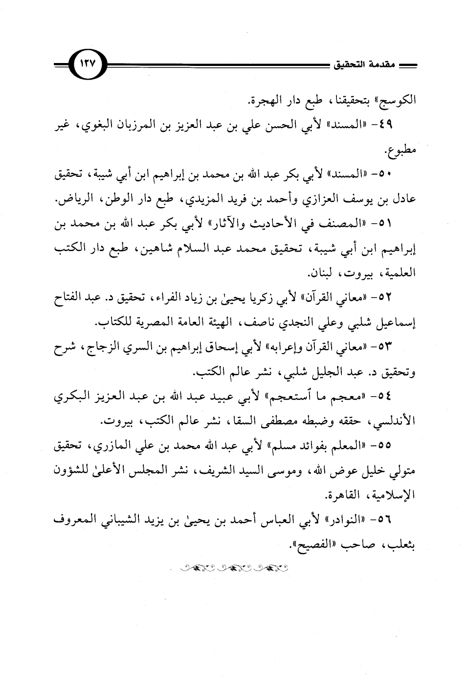 55 - "المعلم بفوائد مسلم" لأبي عبد الله محمَّد بن علي المازري، تحقيق متولي خليل عوض الله، وموسى السيد الشريف، نشر المجلس الأعلى للشؤون الإِسلامية، القاهرة.