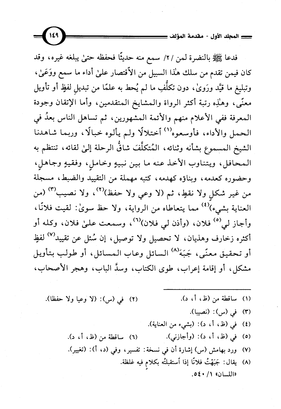 فدعا - صلى الله عليه وسلم - بالنضرة لمن /2/ سمع منه حديثًا فحفظه حتى يبلغه غيره، وقد كان فيمن تقدم من سلك هذا السبيل من الاقتصار على أداء ما سمع ووَعَى، وتبليغ ما قيَّد ورَوى، دون تكلُّفِ ما لم يُحط به علمًا من تبديلِ لفظٍ أو تأويل معنًى، وهذِه رتبة أكثر الرواة والمشايخ المتقدمين، وأما الإتقان وجودة المعرفة ففي الأعلام منهم والأئمة المشهورين، ثم تساهل الناس بعدُ في الحمل والأداء، فأوسعوه (¬1) اختلالًا ولم يألوه خبالًا، وربما شاهدنا الشيخ المسموع بشأنه وثنائه، المُتكلَّفَ شاقُّ الرحلة إلى لقائه، تنتظم به المحافل، ويتناوب الأخذ عنه ما بين نبيهٍ وخاملٍ، وفقيهٍ وجاهلٍ، وحضوره كعدمه، وبناؤه كهدمه، كتبه مهملة من التقييد والضبط، مسجلة من غير شكلٍ ولا نقطٍ، ثم (لا وعي ولا حفظ) (¬2)، ولا نصيب (¬3) (من العناية بشيء) (¬4) مما يتعاطاه من الرواية، ولا حظ سوى: لقيت فلانًا، وأجاز لي (¬5) فلان، (وأذن لي فلان) (¬6)، وسمعت على فلان، وكله أو أكثره زخارف وهذيان، لا تحصيل ولا توصيل، إن سُئل عن تقييد (¬7) لفظٍ أو تحقيق معنى، جَبَهَ (¬8) السائل وعاب المسائل، أو طولب بتأويل مشكل، أو إقامة إعراب، طوى الكتاب، وسدَّ الباب، وهجر الأصحاب،