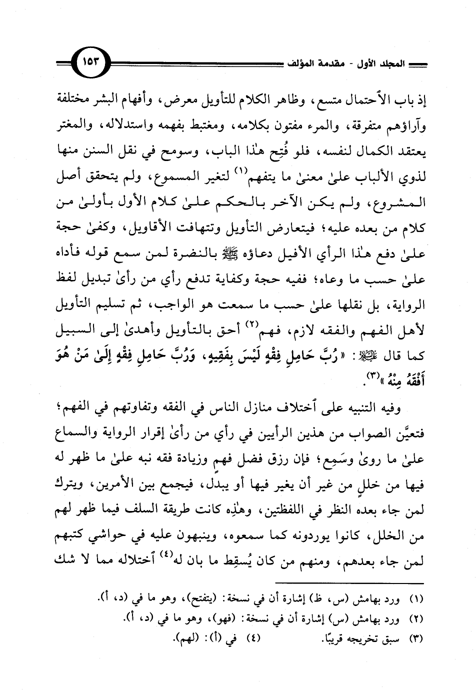 إذ باب الاحتمال متسع، وظاهر الكلام للتأويل معرض، وأفهام البشر مختلفة وآراؤهم متفرقة، والمرء مفتون بكلامه، ومغتبط بفهمه واستدلاله، والمغتر يعتقد الكمال لنفسه، فلو فُتِح هذا الباب، وسومح في نقل السنن منها لذوي الألباب على معنى ما يتفهم (¬1) لتغير المسموع، ولم يتحقق أصل المشروع، ولم يكن الآخر بالحكم على كلام الأول بأولى من كلام من بعده عليه؛ فيتعارض التأويل وتتهافت الأقاويل، وكفى حجة على دفع هذا الرأي الأفيل دعاؤه - صلى الله عليه وسلم - بالنضرة لمن سمع قوله فأداه على حسب ما وعاه؛ ففيه حجة وكفاية تدفع رأي من رأى تبديل لفظ الرواية، بل نقلها على حسب ما سمعت هو الواجب، ثم تسليم التأويل لأهل الفهم والفقه لازم، فهم (¬2) أحق بالتأويل وأهدى إلى السبيل كما قال - عليه السلام -: "رُبَّ حَامِلِ فِقْهٍ لَيْسَ بِفَقِيهٍ، وَرُبَّ حَامِلِ فِقْهٍ إلى مَنْ هُوَ أَفْقَهُ مِنْهُ" (¬3).