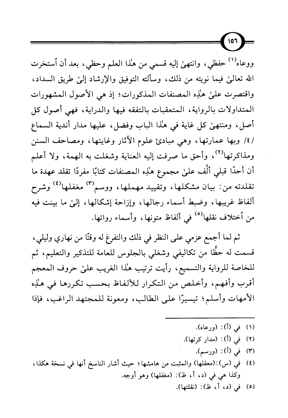 ووعاه (¬1) حفظي، وانتهى إليه قسمي من هذا العلم وحظي، بعد أن استخرت الله تعالى فيما نويته من ذلك، وسألته التوفيق والإرشاد إلى طريق السداد، واقتصرت على هذِه المصنفات المذكورات؛ إذ هي الأصول المشهورات المتداولات بالرواية، المتعقبات بالتفقه فيها والدراية، فهي أصول كل أصل، ومنتهى كل غاية في هذا الباب وفضل، عليها مدار أندية السماع وبها عمارتها، وهي مبادئ علوم الآثار وغايتها، ومصاحف السنن ومذاكرتها (¬2)، وأحق ما صرفت إليه العناية وشغلت به الهمة، ولا أعلم أن أحدًا قبلي ألَّف على مجموع هذِه المصنفات كتابًا مفردًا تقلد عهدة ما تقلدته من: بيان مشكلها، وتقييد مهملها، ووسم (¬3) مغفلها (¬4) وشرح ألفاظ غريبها، وضبط أسماء رجالها، وإزاحة إشكالها، إلى ما بينت فيه من اختلاف نقلها (¬5) في ألفاظ متونها، وأسماء رواتها.