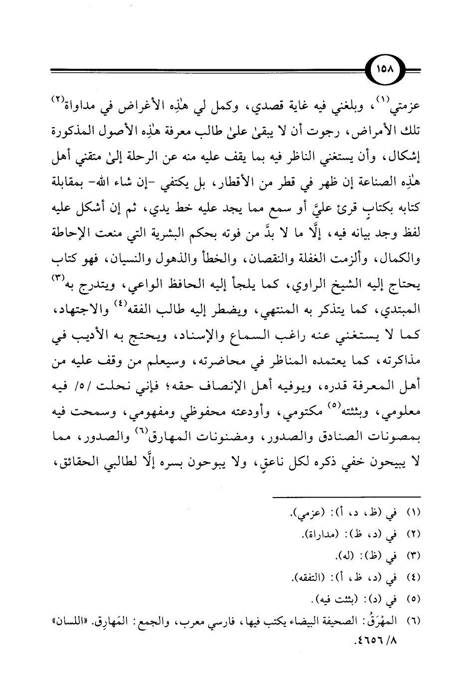 عزمتي (¬1)، وبلغني فيه غاية قصدي، وكمل لي هذِه الأغراض في مداواة (¬2) تلك الأمراض، رجوت أن لا يبقى على طالب معرفة هذِه الأصول المذكورة إشكال، وأن يستغني الناظر فيه بما يقف عليه منه عن الرحلة إلى متقني أهل هذِه الصناعة إن ظهر في قطر من الأقطار، بل يكتفي - إن شاء الله - بمقابلة كتابه بكتابٍ قرئ عليَّ أو سمع مما يجد عليه خط يدي، ثم إن أشكل عليه لفظ وجد بيانه فيه، إلَّا ما لا بدَّ من فوته بحكم البشرية التي منعت الإحاطة والكمال، وألزمت الغفلة والنقصان، والخطأ والذهول والنسيان، فهو كتاب يحتاج إليه الشيخ الراوي، كما يلجأ إليه الحافظ الواعي، ويتدرج به (¬3) المبتدي، كما يتذكر به المنتهي، ويضطر إليه طالب الفقه (¬4) والاجتهاد، كما لا يستغني عنه راغب السماع والإسناد، ويحتج به الأديب في مذاكرته، كما يعتمده المناظر في محاضرته، وسيعلم من وقف عليه من أهل المعرفة قدره، ويوفيه أهل الإنصاف حقه؛ فإني نحلت فيه معلومي، وبثثته (¬5) مكتومي، وأودعته محفوظي ومفهومي، وسمحت فيه بمصونات الصنادق والصدور، ومضنونات المهارق (¬6) والصدور، مما لا يبيحون خفي ذكره لكل ناعقٍ، ولا يبوحون بسره إلا لطالبي الحقائق،