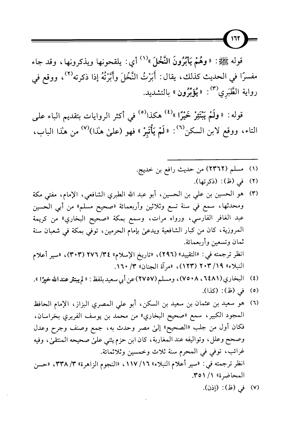 (¬6) هو سعيد بن عثمان بن سعيد بن السكن، أبو علي المصري البزاز، الإمام الحافظ المجود الكبير، سمع "صحيح البخاري" من محمد بن يوسف الفربري بخراسان، فكان أول من جلب "الصحيح" إلى مصر وحدث به، جمع وصنف وجرح وعدل وصحح وعلل، وتواليفه عند المغاربة، كان ابن حزم يثني على صحيحه المنتقى، وفيه غرائب، توفي في المحرم سنة ثلاث وخمسين وثلاثمائة.