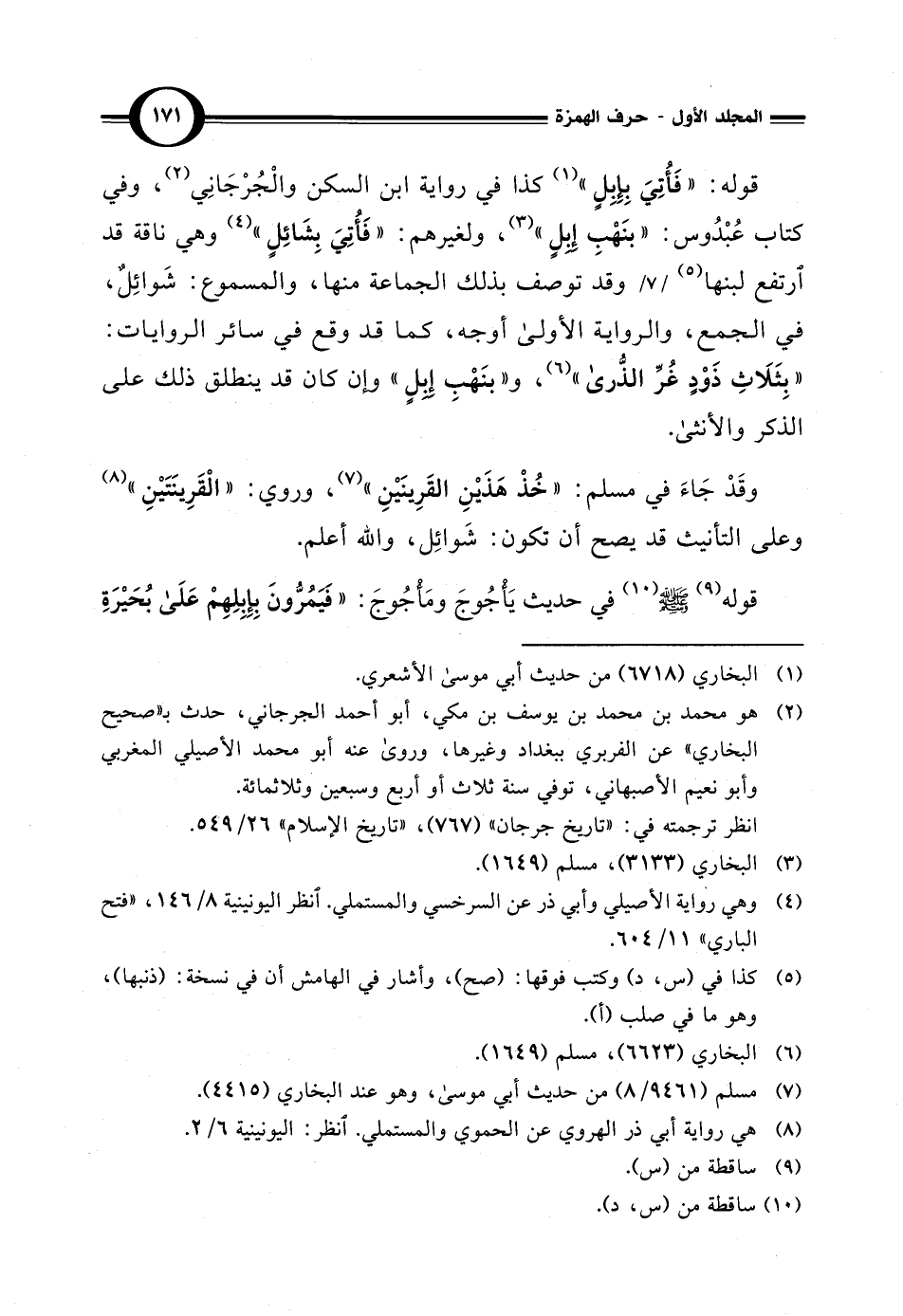 قوله: "فَأُتِيَ بِإِبِلٍ" (¬1) كذا في رواية ابن السكن والْجُرْجَانِي (¬2)، وفي كتاب عُبْدُوس: "بنَهْبِ إبلٍ" (¬3)، ولغيرهم: "فَأُتِيَ بِشَائِلٍ" (¬4) وهي ناقة قد ارتفع لبنها (¬5) وقد توصف بذلك الجماعة منها، والمسموع: شَوائِلٌ، في الجمع، والرواية الأولى أوجه، كما قد وقع في سائر الروايات: "بِثَلَاثِ ذَوْدٍ غُرِّ الذُّرى" (¬6)، و"بنَهْبِ إبلٍ" وإن كان قد ينطلق ذلك على الذكر والأنثى.