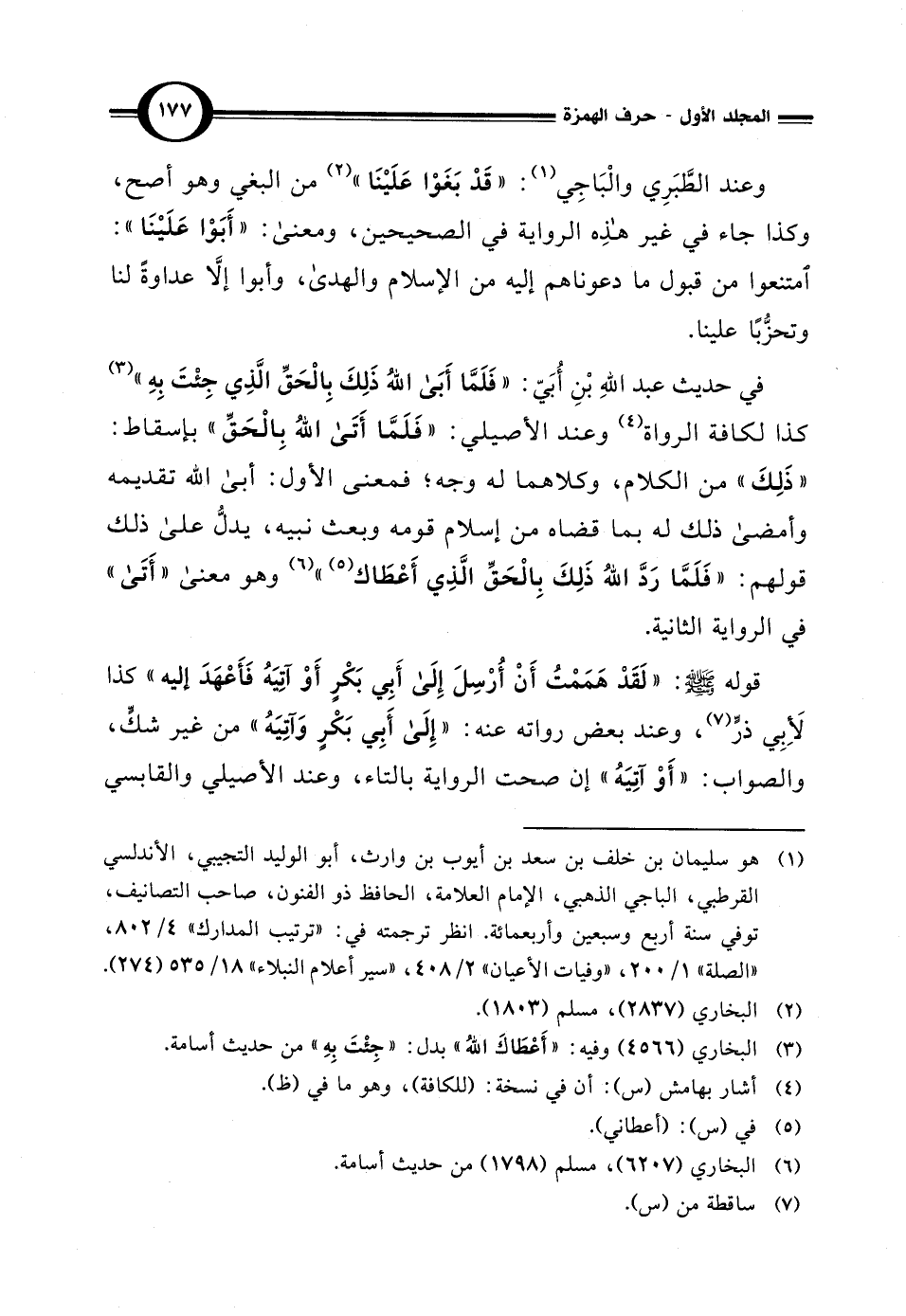 (¬1) هو سليمان بن خلف بن سعد بن أيوب بن وارث، أبو الوليد التجيبي، الأندلسي القرطبي، الباجي الذهبي، الإمام العلامة، الحافظ ذو الفنون، صاحب التصانيف، توفي سنة أربع وسبعين وأربعمائة. انظر ترجمته في: "ترتيب المدارك" 4/ 802، "الصلة" 1/ 200، "وفيات الأعيان" 2/ 408، "سير أعلام النبلاء" 18/ 535 (274).