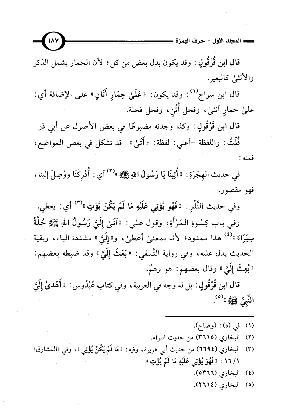 قُلْتُ: واللفظة - أعني: لفظة: "أَتَى" - قد تشكل في بعض المواضع، فمنه: في حديث الهِجْرَةِ: "أُتِينَا يَا رَسُولَ اللهِ في - صلى الله عليه وسلم - " (¬2) أي: أُدْرِكْنَا ووُصِلَ إلينا، فهو مقصور.