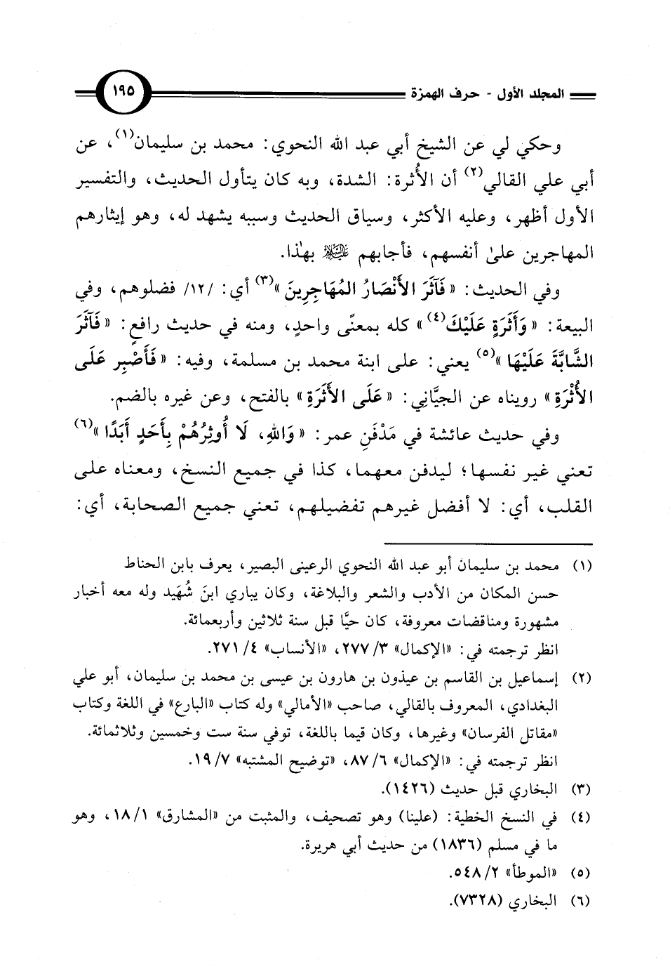 وحكي لي عن الشيخ أبي عبد الله النحوي: محمد بن سليمان (¬1)، عن أبي علي القالي (¬2) أن الأُثرة: الشدة، وبه كان يتأول الحديث، والتفسير الأول أظهر، وعليه الأكثر، وسياق الحديث وسببه يشهد له، وهو إيثارهم المهاجرين على أنفسهم، فأجابهم - عليه السلام - بهذا.