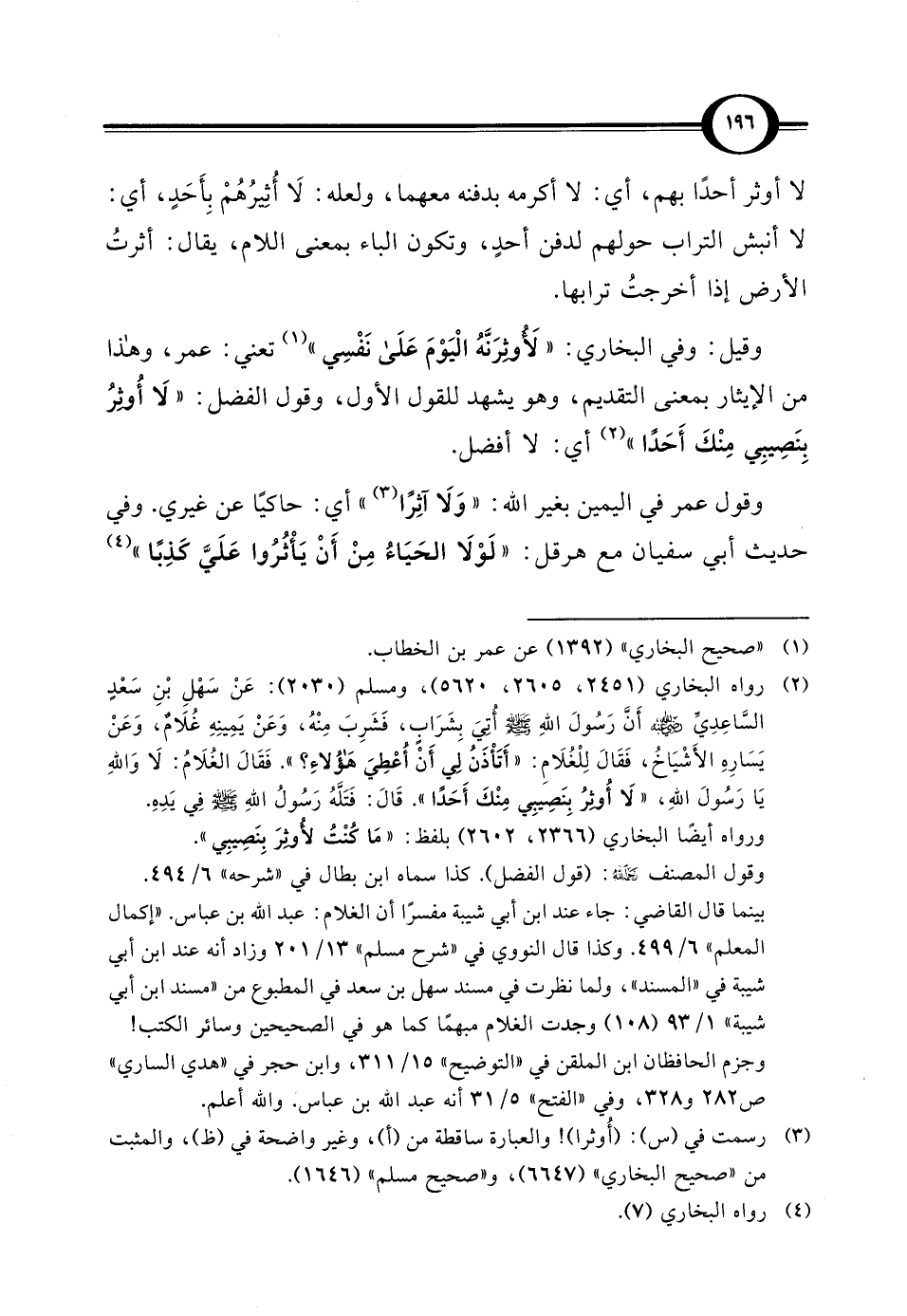 وقيل: وفي البخاري: " لَأُوثِرَنَّهُ الْيَوْمَ عَلَى نَفْسِي" (¬1) تعني: عمر، وهذا من الإيثار بمعنى التقديم، وهو يشهد للقول الأول، وقول الفضل: "لَا أُوثرُ بِنَصِيبِي مِنْكَ أَحَدًا" (¬2) أي: لا أفضل.