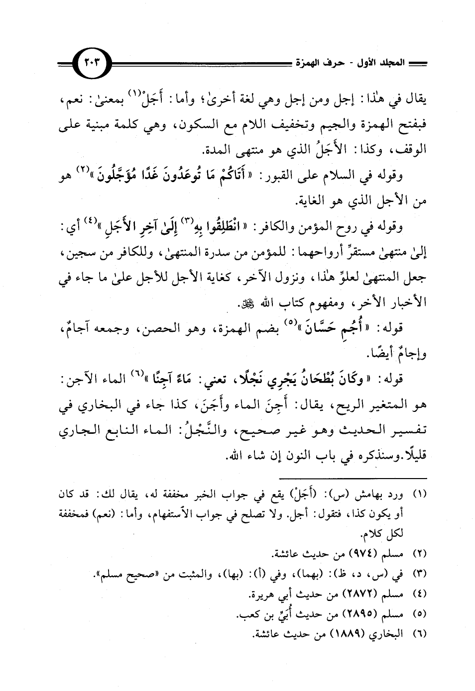 (¬1) ورد بهامش (س): (أَجَلْ) يقع في جواب الخبر مخففة له، يقال لك: قد كان أو يكون كذا، فتقول: أجل. ولا تصلح في جواب الاستفهام، وأما: (نعم) فمخففة لكل كلام.
