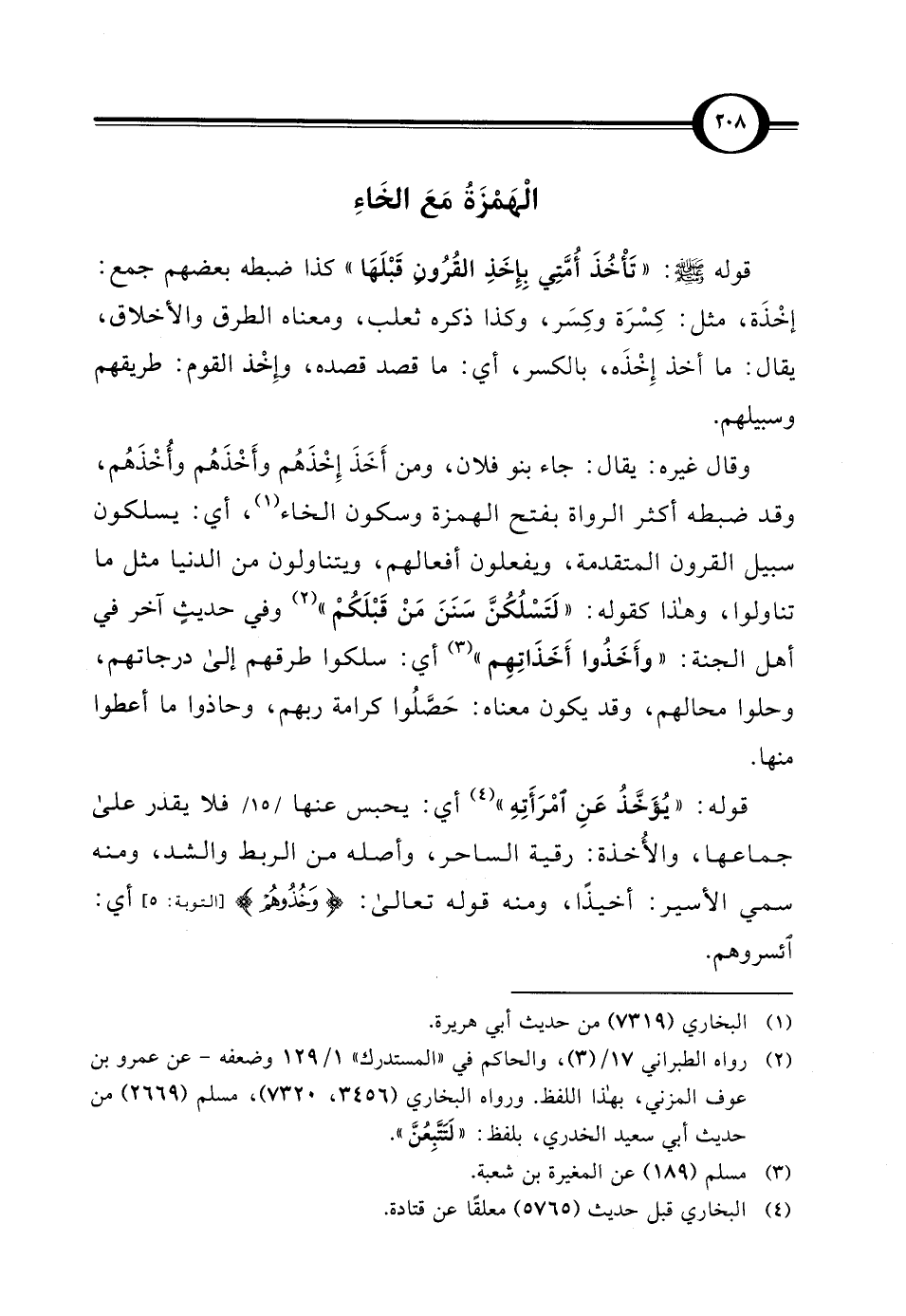 قوله - صلى الله عليه وسلم -: "تَأْخُذَ أُمَّتِي بِإِخَذِ القُرُون قَبْلَهَا" كذا ضبطه بعضهم جمع: إخْذَة، مثل: كِسْرَة وكِسَر، وكذا ذكره ثعلب، ومعناه الطرق والأخلاق، يقال: ما أخذ إِخْذَه، بالكسر، أي: ما قصد قصده، وإِخْذ القوم: طريقهم وسبيلهم.