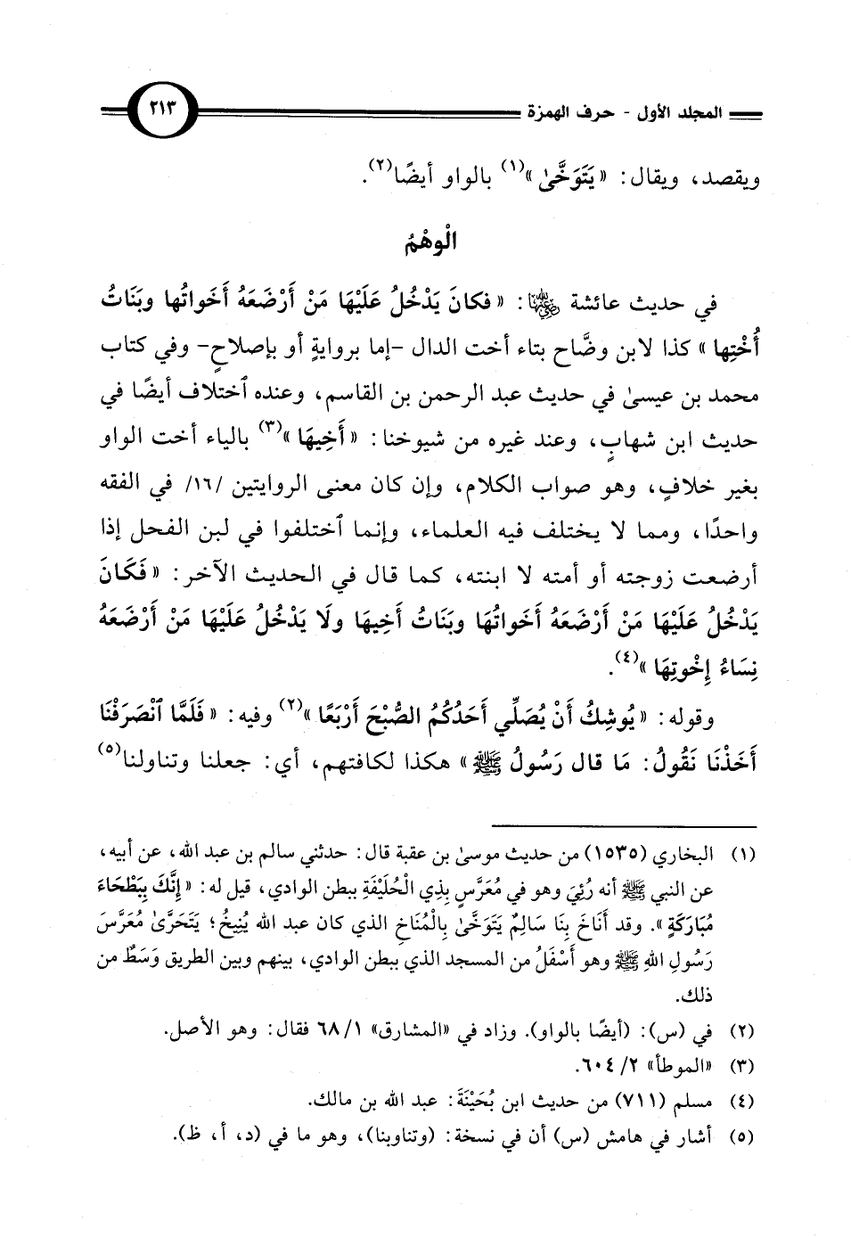 في حديث عائشة - رضي الله عنها -: "فكانَ يدخلُ عَلَيْهَا مَنْ أَرْضَعَهُ أَخَواتُها وبَنَاتُ أُخْتِها" كذا لابن وضَّاح بتاء أخت الدال - إما بروايةٍ أو بإصلاحٍ - وفي كتاب محمَّد بن عيسى في حديث عبد الرحمن بن القاسم، وعنده اختلاف أيضاً في حديث ابن شهابٍ، وعند غيره من شيوخنا: "أَخِيهَا" (¬3) بالياء أخت الواو بغير خلافٍ، وهو صواب الكلام، وإن كان معنى الروايتين في الفقه واحداً، ومما لا يختلف فيه العلماء، وإنما اختلفوا في لبن الفحل إذا أرضعت زوجته أو أمته لا ابنته، كما قال في الحديث الآخر: "فَكَانَ يدخُلُ عَلَيْهَا مَنْ أَرْضَعَهُ أَخَواتُهَا وبَنَاتُ أَخِيهَا ولَا يدخلُ عَلَيْهَا مَنْ أَرْضَعَهُ نِسَاءُ إِخْوتِهَا" (¬4).