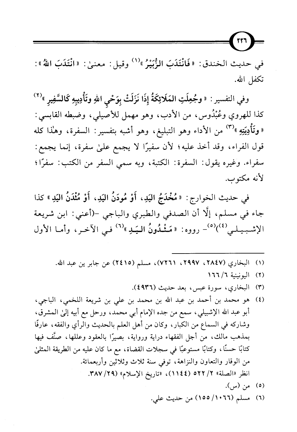 وفي التفسير: "وجُعِلَتِ المَلَائِكَةُ إِذَا نَزَلَتْ بِوَحْيِ اللهِ وتَأْدِيبِهِ كَالسَّفِيرِ" (¬2) كذا للهروي وعُبْدُوس، من الأدب، وهو مهمل للأصيلي، وضبطه القابسي: "وتَأْدِيَتِهِ" (¬3) من الأداء وهو التبليغ، وهو أشبه بتفسير: السفرة، وهذا كله قول الفراء، وقد أخذ عليه؛ لأن سفيرًا لا يجمع على سفرة، إنما يجمع: سفراء. وغيره يقول: السفرة: الكتبة، وبه سمي السفر من الكتب: سفرًا؛ لأنه مكتوب.
