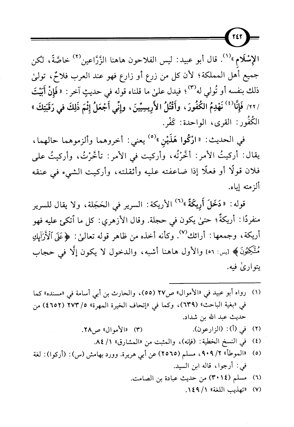 الإِسْلَامِ" (¬1). قال أبو عبيد: ليس الفلاحون ها هنا الزرَّاعين (¬2) خاصَةً، لكن جميع أهل المملكة؛ لأن كل من زرع أو زارع فهو عند العرب فلاحٌ، تولى ذلك بنفسه أو تُولي له (¬3)؛ فيدل على ما قلناه قوله في حديثٍ آخر: "فَإِنْ أَبَيْتَ فَإنَّا (¬4) نَهْدِمُ الكُفُورَ، وأَقْتُلُ الأرِيسِيِّينَ، وإِنِّي أَجْعَلُ إِثْمَ ذَلِكَ في رَقَبَتِكَ" الكُفُور: القرى، الواحدة: كَفْر.