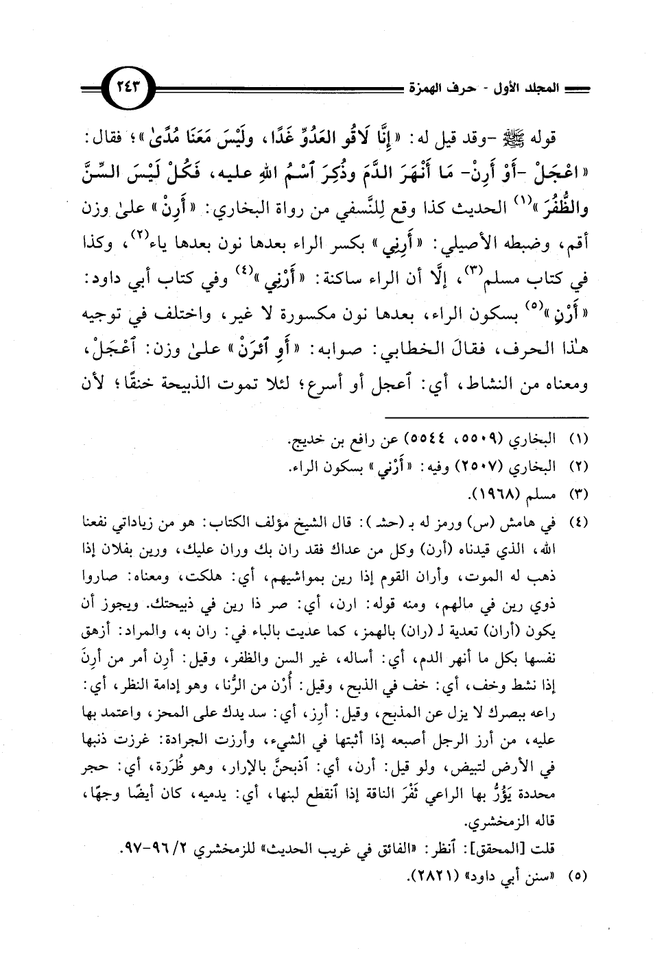 (¬4) في هامش (س) ورمز له بـ (حشـ): قال الشيخ مؤلف الكتاب: هو من زياداتي نفعنا الله، الذي قيدناه (أرن) وكل من عداك فقد ران بك وران عليك، ورين بفلان إذا ذهب له الموت، وأران القوم إذا رين بمواشيهم، أي: هلكت، ومعناه: صاروا ذوي رين في مالهم، ومنه قوله: ارن، أي: صر ذا رين في ذبيحتك. ويجوز أن يكون (أران) تعدية لـ (ران) بالهمز، كما عديت بالباء في: ران به، والمراد: أزهق نفسها بكل ما أنهر الدم، أي: أساله، غير السنن والظفر، وقيل: أرِن أمر من أرِنَ إذا نشط وخف، أي: خف في الذبح، وقيل: أُرْن من الرُّنا، وهو إدامة النظر، أي: راعه ببصرك لا يزل عن المذبح، وقيل: أرِز، أي: سد يدك على المحز، واعتمد بها عليه، من أرز الرجل أصبعه إذا أثبتها في الشيء، وأرزت الجرادة: غرزت ذنبها في الأرض لتبيض، ولو قيل: أرن، أي: اذبحنَّ بالإرار، وهو ظُرَرة، أي: حجر محددة يَؤُرُّ بها الراعي ثَفْرَ الناقة إذا انقطع لبنها، أي: يدميه، كان أيضا وجهًا، قاله الزمخشري. قلت [المحقق]: انظر: "الفائق في غريب الحديث" للزمخشري 2/ 96 - 97.