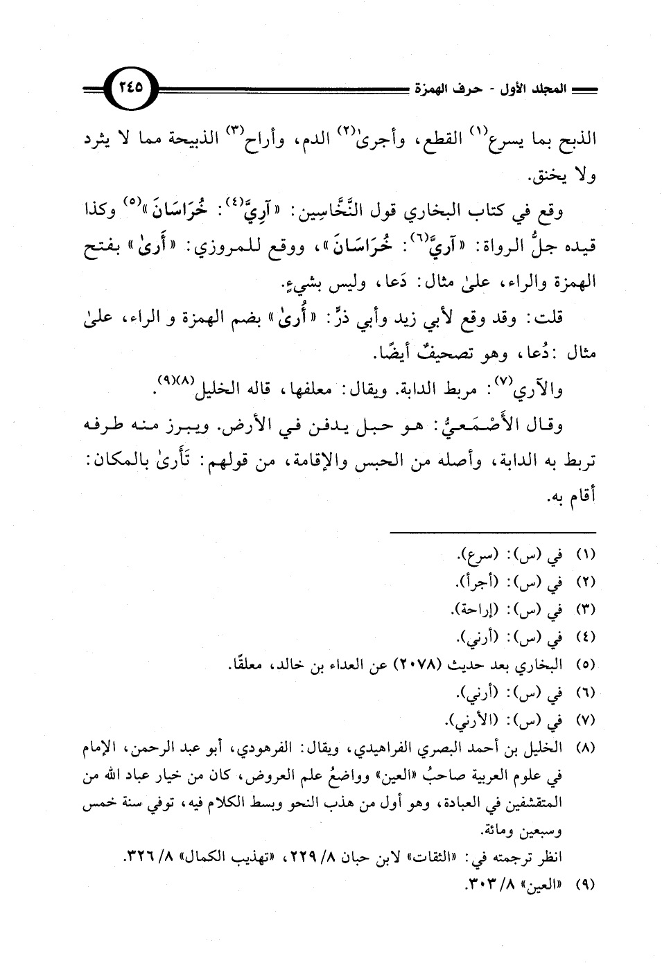 وقع في كتاب البخاري قول النَّخَّاسِين: "آرِيَّ (¬4): خُرَاسَانَ" (¬5) وكذا قيده جلُّ الرواة: "آريَّ (¬6): خُرَاسَانَ"، ووقع للمروزي: "أَرى" بفتح الهمزة والراء، على مثال: دَعا، وليس بشيءٍ.