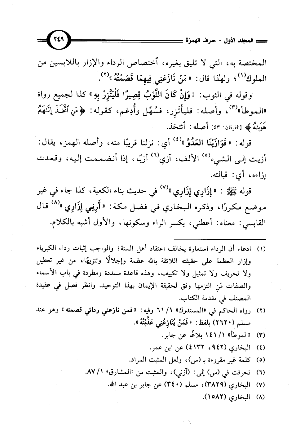(¬1) ادعاء أن الرداء استعارة يخالف اعتقاد أهل السنة؛ والواجب إثبات رداء الكبرياء وإزار العظمة على حقيقته اللائقة بالله عظمة وإجلالًا وتنزيهًا، من غير تعطيل ولا تحريف ولا تمثيل ولا تكييف، وهذه قاعدة مسددة ومطردة في باب الأسماء والصفات مَنِ التزمها وفق لحقيقة الإيمان بهذا التوحيد. وانظر فصل في عقيدة المصنف في مقدمة الكتاب.