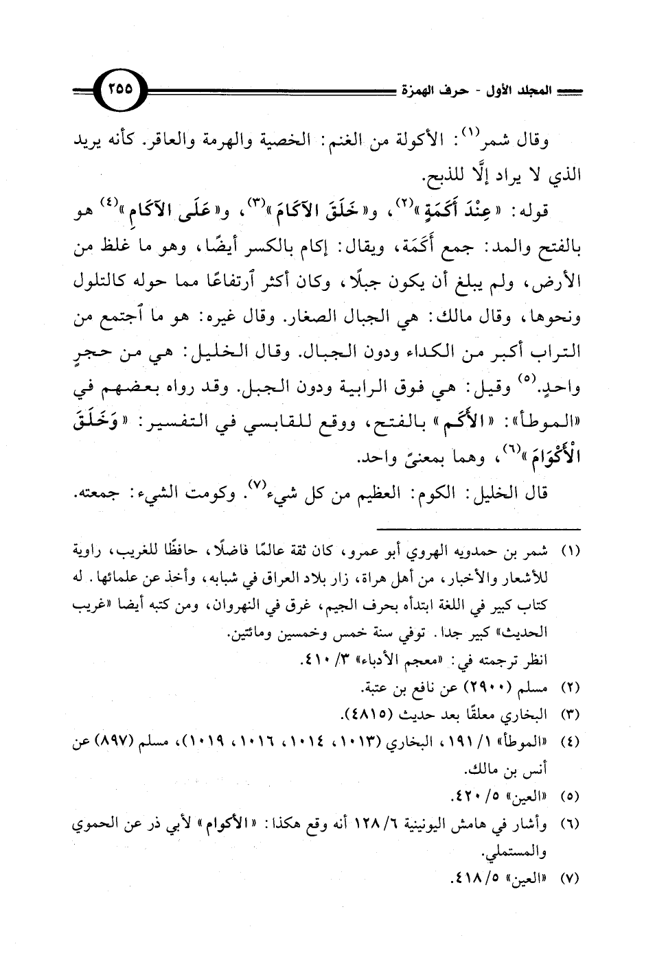 قوله: "عِنْدَ أَكَمَةٍ" (¬2)، و"خَلَقَ الآكَامَ" (¬3)، و"عَلَى الآكامِ" (¬4) هو بالفتح والمد: جمع أَكَمَة، ويقال: إكام بالكسر أيضًا، وهو ما غلظ من الأرض، ولم يبلغ أن يكون جبلاً، وكان أكثر ارتفاعًا مما حوله كالتلول ونحوها، وقال مالك: هي الجبال الصغار. وقال غيره: هو ما اجتمع من التراب أكبر من الكداء ودون الجبال. وقال الخليل: هي من حجرٍ واحدٍ. (¬5) وقيل: هي فوق الرابية ودون الجبل. وقد رواه بعضهم في "الموطأ": "الأَكَم" بالفتح، ووقع للقابسي في التفسير: "وَخَلَقَ الأَكْوَامَ" (¬6)، وهما بمعنىً واحد.