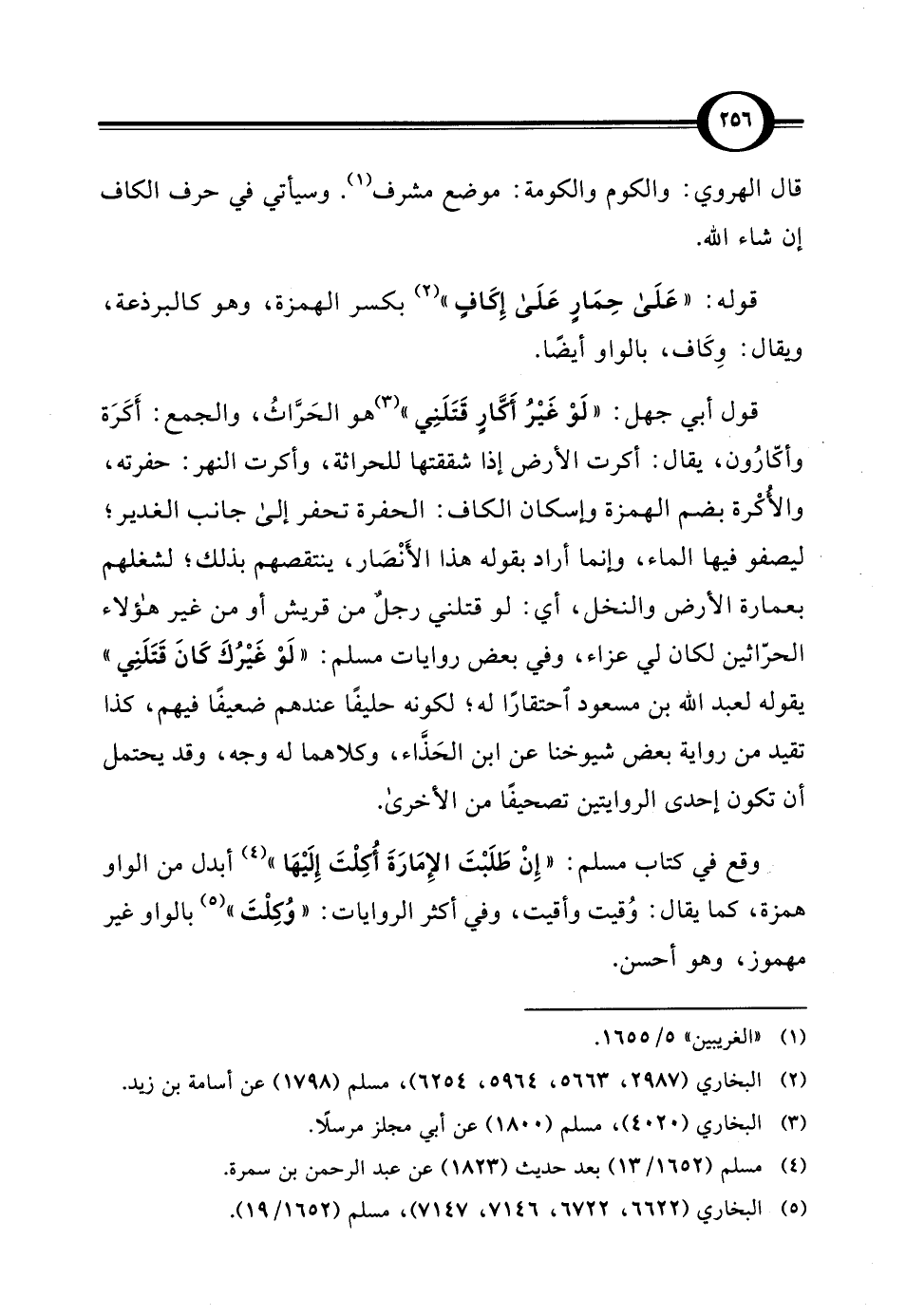 قول أبي جهل: "لَوْ غَيْرُ أَكَّارٍ قَتَلَنِي" (¬3) هو الحَرَّاثُ، والجمع: أَكَرَة وأكّارُون، يقال: أكثرت الأرض إذا شققتها للحراثة، وأكرت النهر: حفرته، والأُكْرة بضم الهمزة وإسكان الكاف: الحفرة تحفر إلى جانب الغدير؛ ليصفو فيها الماء، وإنما أراد بقوله هذا الأَنْصَار، ينتقصهم بذلك؛ لشغلهم بعمارة الأرض والنخل، أي: لو قتلني رجلٌ من قريش أو من غير هؤلاء الحرّاثين لكان لي عزاء، وفي بعض روايات مسلم: "لَوْ غَيْرُكَ كَانَ قَتَلَنِي" يقوله لعبد الله بن مسعود احتقارًا له؛ لكونه حليفًا عندهم ضعيفًا فيهم، كذا تقيد من رواية بعض شيوخنا عن ابن الحَذَّاء، وكلاهما له وجه، وقد يحتمل أن تكون إحدى الروايتين تصحيفًا من الأخرى.