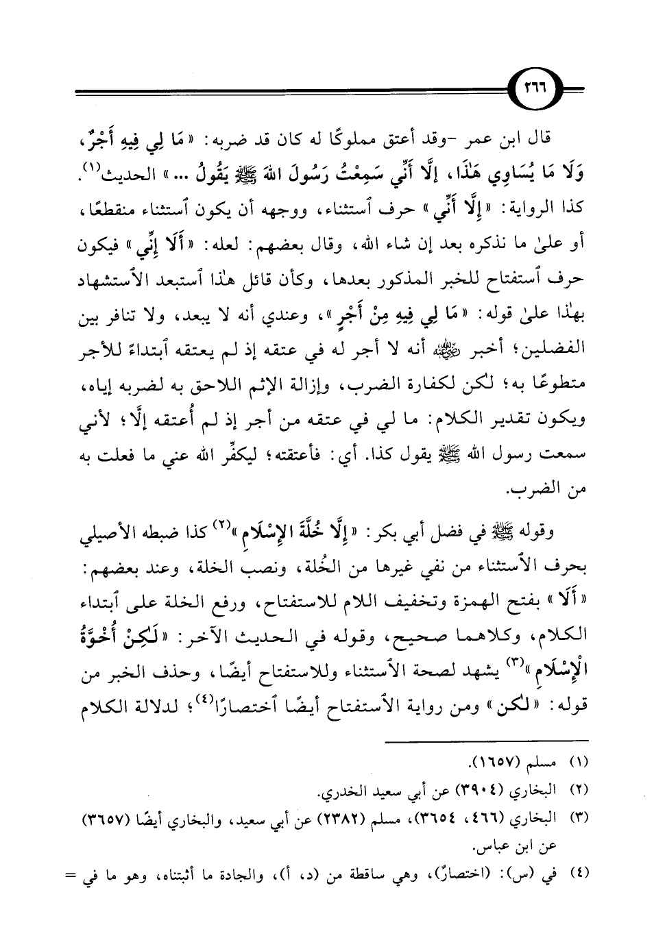 قال ابن عمر - وقد أعتق مملوكَّاَ له كان قد ضربه: "مَا لِي فِيهِ أَجْرٌ، وَلَا مَا يُسَاوِي هَذَا، إلاَّ أَنِّي سَمِعْتُ رَسُولَ الله - صلى الله عليه وسلم - يَقُولُ ... " الحديث (¬1).