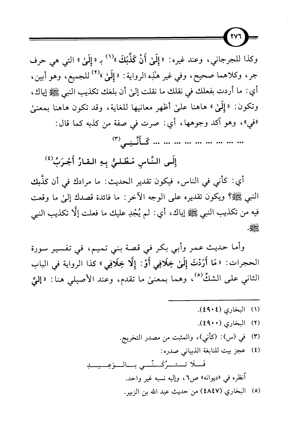وكذا للجرجاني، وعند غيره: "إلَى أَنْ كَذَّبَكَ" (¬1) بـ "إلى" التي هي حرف جر، وكلاهما صحيح، وفي غير هذِه الرواية: "إلى" (¬2) للجميع، وهو أبين، أي: ما أردت بفعلك في نقلك ما نقلت إلى أن بلغك تكذيب النبي - صلى الله عليه وسلم - إياك، وتكون: "إلى" هاهنا على أظهر معانيها للغاية، وقد تكون هاهنا بمعنى "في"، وهو آكد وجوهها، أي: صرت في صفة من كذبه كما قال:
