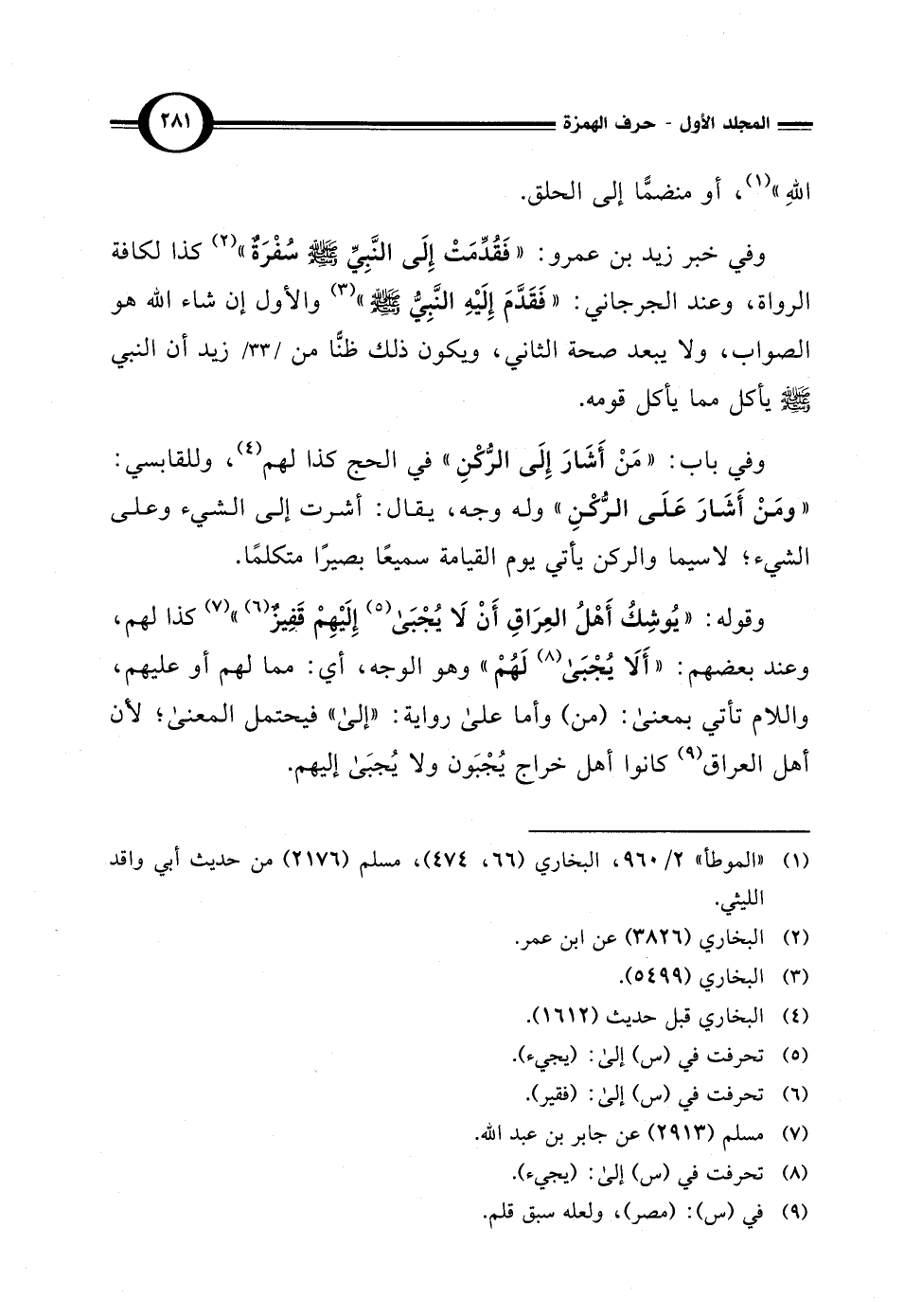 وفي خبر زيد بن عمرو: "فَقُدِّمَتْ إِلَى النَّبِيِّ - صلى الله عليه وسلم - سُفْرَةٌ" (¬2) كذا لكافة الرواة، وعند الجرجاني: "فَقَدَّمَ إِلَيْهِ النَّبِيُّ - صلى الله عليه وسلم - " (¬3) والأول إن شاء الله هو الصواب، ولا يبعد صحة الثاني، ويكون ذلك ظنًّا من زيد أن النبي - صلى الله عليه وسلم - يأكل مما يأكل قومه.
