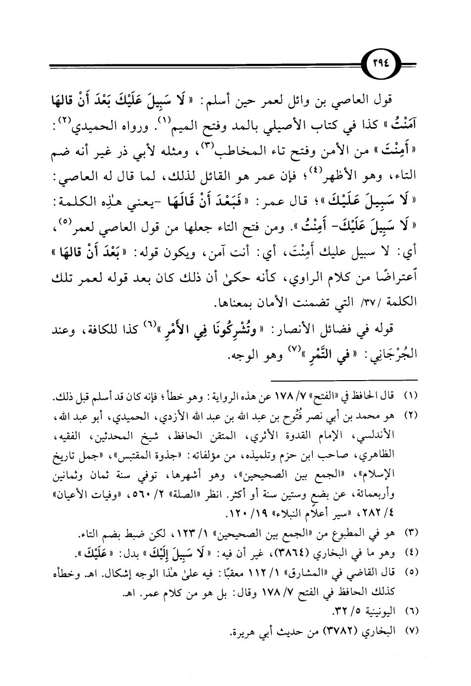 قول العاصي بن وائل لعمر حين أسلم: "لَا سَبِيلَ عَلَيْكَ بَعْدَ أَنْ قالهَا آمَنْتُ" كذا في كتاب الأصيلي بالمد وفتح الميم (¬1). ورواه الحميدي (¬2): "أَمِنْتَ" من الأمن وفتح تاء المخاطب (¬3)، ومثله لأبي ذر غير أنه ضم التاء، وهو الأظهر (¬4)؛ فإن عمر هو القائل لذلك، لما قال له العاصي: "لَا سَبِيلَ عَلَيْكَ"؛ قال عمر: "فَبَعْدَ أَنْ قَالَهَا - يعني هذِه الكلمة: "لَا سَبِيلَ عَلَيْكَ- أَمِنْتُ". ومن فتح التاء جعلها من قول العاصي لعمر (¬5)، أي: لا سبيل عليك أَمِنْتَ، أي: أنت آمن، ويكون قوله: "بَعْدَ أَنْ قالهَا" اعتراضًا من كلام الراوي، كأنه حكى أن ذلك كان بعد قوله لعمر تلك الكلمة التي تضمنت الأمان بمعناها.