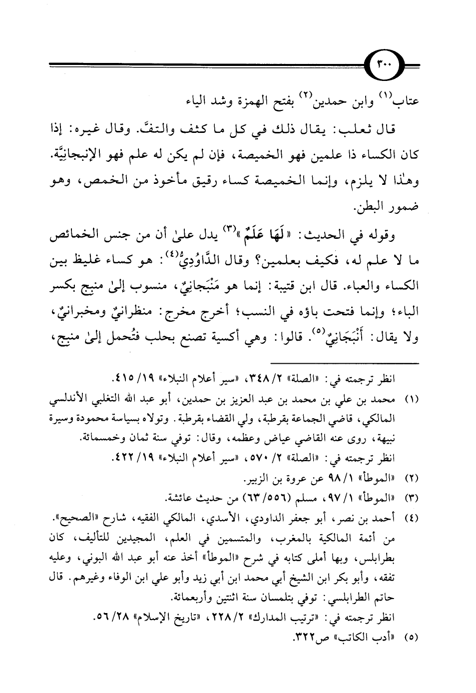 عتاب (¬1) وابن حمدين (¬2) بفتح الهمزة وشد الياء قال ثعلب: يقال ذلك في كل ما كثف والتفَّ. وقال غيره: إذا كان الكساء ذا علمين فهو الخميصة، فإن لم يكن له علم فهو الإنبجانِيَّة.