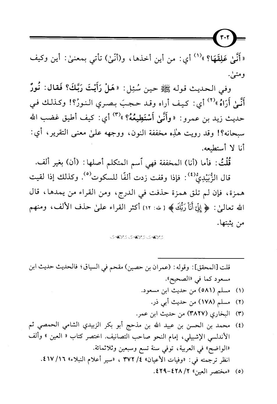 وفي الحديث قوله - صلى الله عليه وسلم - حين سُئِل: " هَلْ رَأَيْتَ رَبَّكَ؟ فَقال: نُورٌ أَنَّى أَرَاهُ" (¬2) أي: كيف أراه وقد حجبَ بصري النورُ؟! وكذلك في حديث زيد بن عمرو: "وأَنَّى أَسْتَطِيعُهُ؟ " (¬3) أي: كيف أطيق غضب الله سبحانه؟! وقد رويت هذِه مخففة النون، ووجهه علي معنى التقرير، أي: أنا لا أستطيعه.