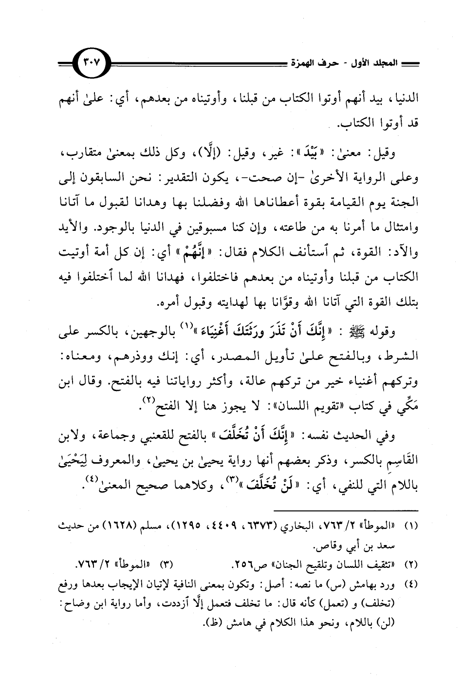وقوله - صلى الله عليه وسلم -: "إِنَّكَ أَنْ تَذَرَ ورَثَتَكَ أَغْنِيَاءَ" (¬1) بالوجهين، بالكسر على الشرط، وبالفتح علي تأويل المصدر، أي: إنك ووذرهم، ومعناه: وتركهم أغنياء خير من تركهم عالة، وأكثر رواياتنا فيه بالفتح. وقال ابن مَكِّي في كتاب "تقويم اللسان": لا يجوز هنا إلا الفتح (¬2).