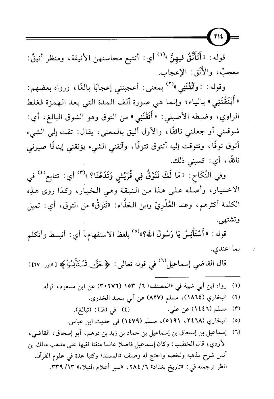 قوله: "أَتَأَنَّقُ فيهِنَّ" (¬1) أي: أتتبع محاسنهن الأنيقة، ومنظر أنيقٌ: معجبٌ، والأَنَق: الإعجاب.