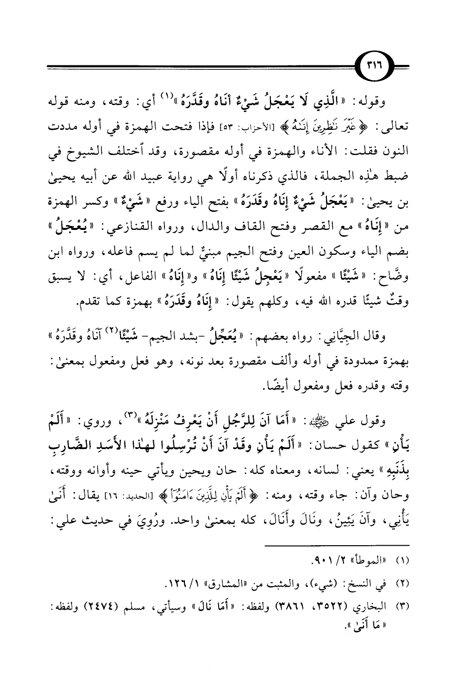 وقوله: "الَّذِي لَا يَعْجَلُ شَيءٌ أنَاهُ وقَدَّرَهُ" (¬1) أي: وقته، ومنه قوله تعالى: {غَيْرَ نَاظِرِينَ إِنَاهُ} [الأحزاب: 53] فإذا فتحت الهمزة في أوله مددت النون فقلت: الأناء والهمزة في أوله مقصورة، وقد اختلف الشيوخ في ضبط هذِه الجملة، فالذي ذكرناه أولاً هي رواية عبيد الله عن أبيه يحيي بن يحيي: "يَعْجَلُ شَيءٌ إِنَاهُ وقَدَرَهُ" بفتح الياء ورفع "شَيءٌ" وكسر الهمزة من "إِنَاهُ" مع القصر وفتح القاف والدال، ورواه القنازعي: "يُعْجَلُ" بضم الياء وسكون العين وفتح الجيم مبنيٌّ لما لم يسم فاعله، ورواه ابن وضَّاح: "شَيْئًا" مفعولًا "يَعْجِلُ شَيْئًا إِنَاهُ" و"إِنَاهُ" الفاعل، أي: لا يسبق وقتٌ شيئًا قدره الله فيه، وكلهم يقول: "إِنَاهُ وقَدَرَهُ" بهمزة كما تقدم.