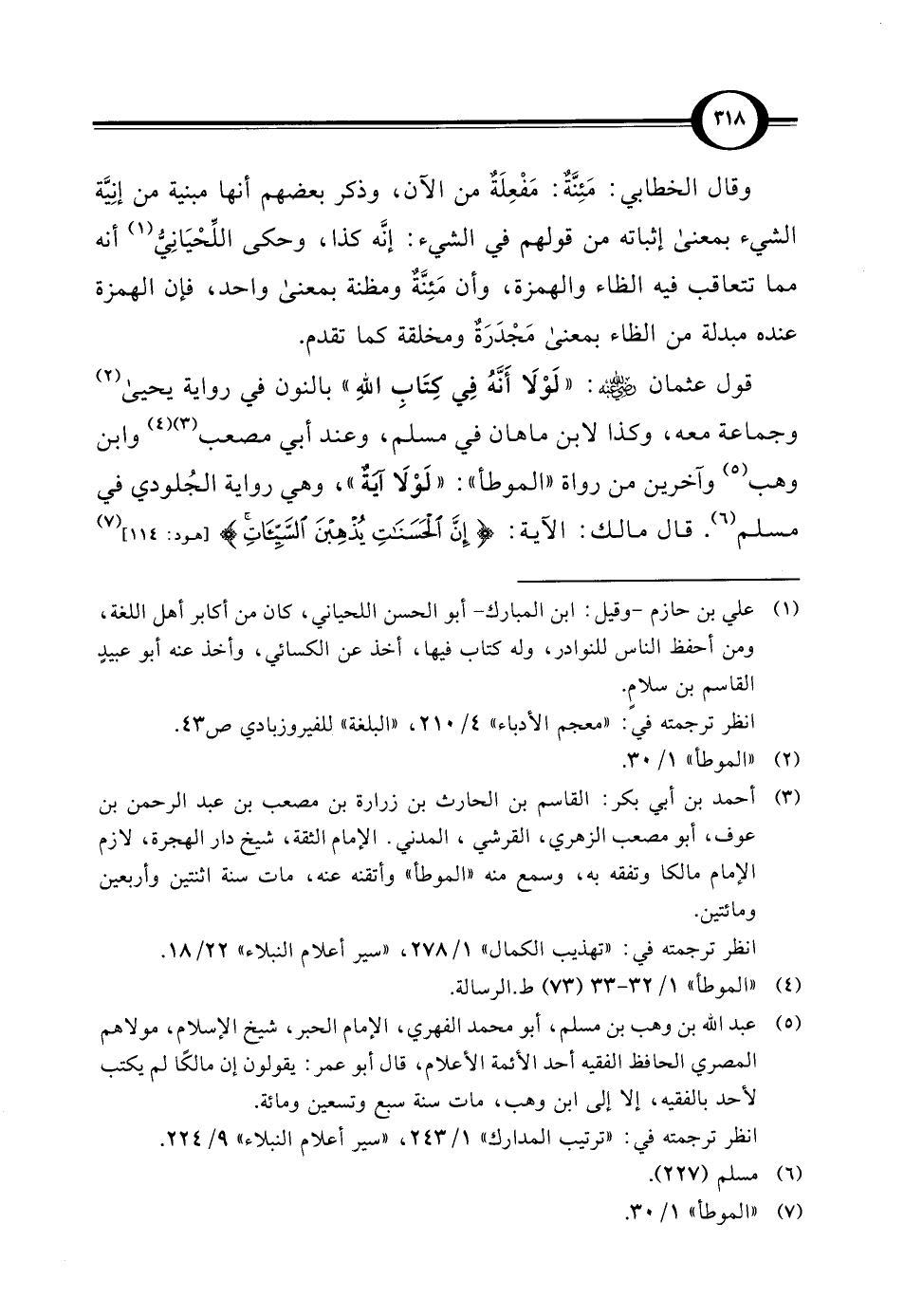 قول عثمان - رضي الله عنه -: "لَوْلَا أَنَّهُ في كِتَابِ اللهِ" بالنون في رواية يحيي (¬2) وجماعة معه، وكذا لابن ماهان في مسلم، وعند أبي مصعب (¬3) (¬4) وابن وهب (¬5) وآخرين من رواة "الموطأ": "لَوْلَا آيةٌ"، وهي رواية الجُلودي في مسلم (¬6). قال مالك: الآية: {إِنَّ الْحَسَنَاتِ يُذْهِبْنَ السَّيِّئَاتِ} [هود: 114] (¬7)
