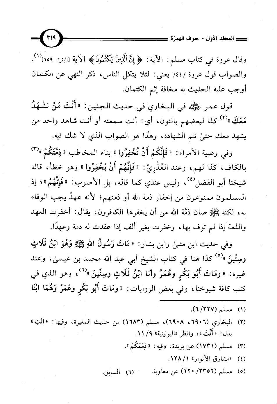 قول عمر - رضي الله عنه - في البخاري في حديث الجنين: "أَنْتَ مَنْ نشْهَدُ مَعَكَ" (¬2) كذا لبعضهم بالنون، أي: أنت سمعته أو أنت شاهد واحد من يشهد معك حتى تتم الشهادة، وهذا هو الصواب الذي لا شك فيه.