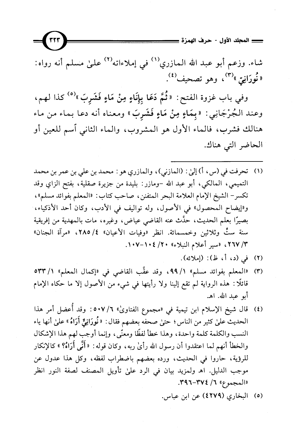 (¬4) قال شيخ الإِسلام ابن تيمية في "مجموع الفتاوى" 6/ 507: وقد أُعضل أمر هذا الحديث على كثير من الناس؛ حتى صحفه بعضهمٍ فقال: "نُورَانِيٌّ أَرَاهُ" على أنها ياء النسب والكلمة كلمة واحدة، وهذا خطأ لفظًا ومعنى، وإنما أوجب لهم هذا الإشكال والخطأ أنهم لما اعتقدوا أن رسول الله - صلى الله عليه وسلم - رأى ربه، وكان قوله: "أَنَّى أَرَاهُ؟ " كالإنكار للرؤية، حاروا في الحديث، ورده بعضهم باضطراب لفظه، وكل هذا عدول عن موجب الدليل. اهـ ولمزيد بيان في الرد على تأويل المصنف لصفة النور انظر "المجموع" 6/ 374 - 396.