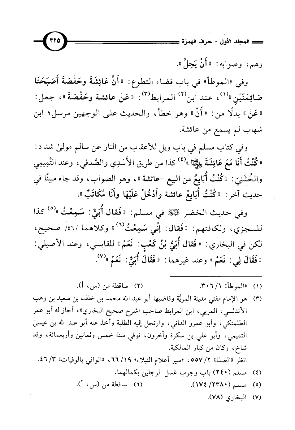 وفي "الموطأ" في باب قضاء التطوع: "أَنَّ عَائِشَةَ وحَفْصَةَ أَصْبَحَتَا صَائِمَتَيْنِ" (¬1)، عند ابن (¬2) المرابط (¬3): "عَنْ عائشة وحَفْصَةَ"، جعل: "عَنْ" بدلاً من: "أَنْ" وهو خطأ، والحديث على الوجهين مرسل؛ ابن شهاب لم يسمع من عائشة.