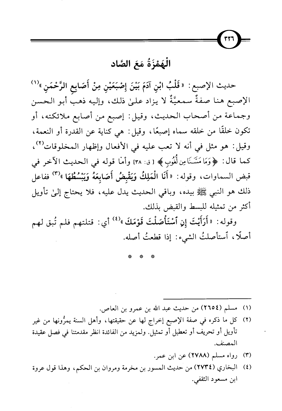 (¬2) كل ما ذكره في صفة الإِصبع إخراج لها عن حقيقتها، وأهل السنة يمرُّونها من غير تأويل أو تحريف أو تعطيل أو تمثيل. ولمزيد من الفائدة انظر مقدمتنا في فصل عقيدة المصنف.