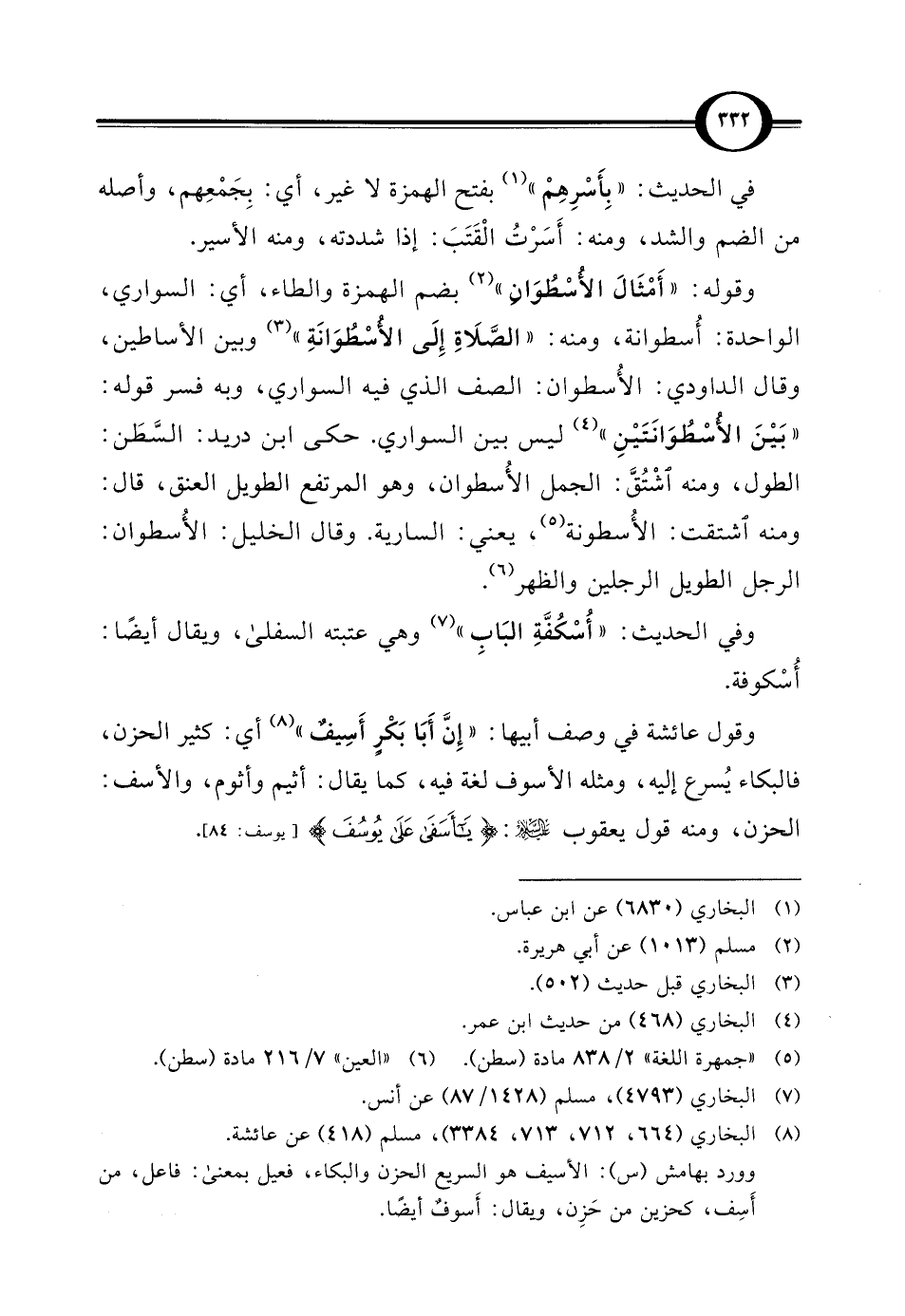 وقول عائشة في وصف أبيها: "إِنَّ أَبَا بَكْرٍ أَسِيفٌ" (¬8) أي: كثير الحزن، فالبكاء يُسرع إليه، ومثله الأسوف لغة فيه، كما يقال: أثيم وأثوم، والأسف: الحزن، ومنه قول يعقوب عليه السلام: {يَا أَسَفَى عَلَى يُوسُفَ} [يوسف: 84].