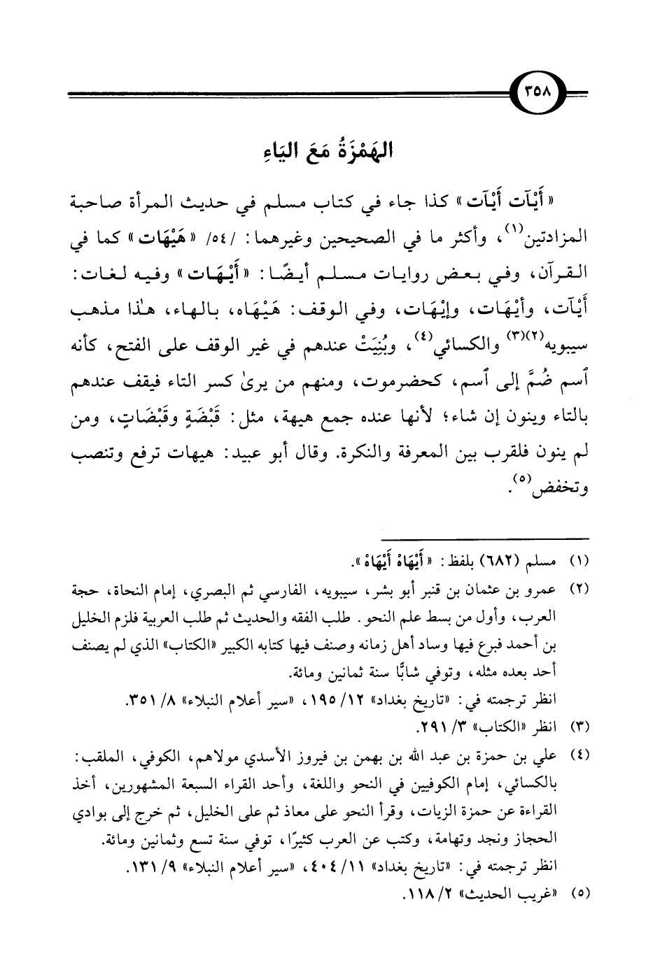 " أَيْآت أَيْآت" كذا جاء في كتاب مسلم في حديث المرأة صاحبة المزادتين (¬1)، وأكثر ما في الصحيحين وغيرهما:"هَيْهَات" كما في القرآن، وفي بعض روايات مسلم أيضًا: "أَيْهَات" وفيه لغات: