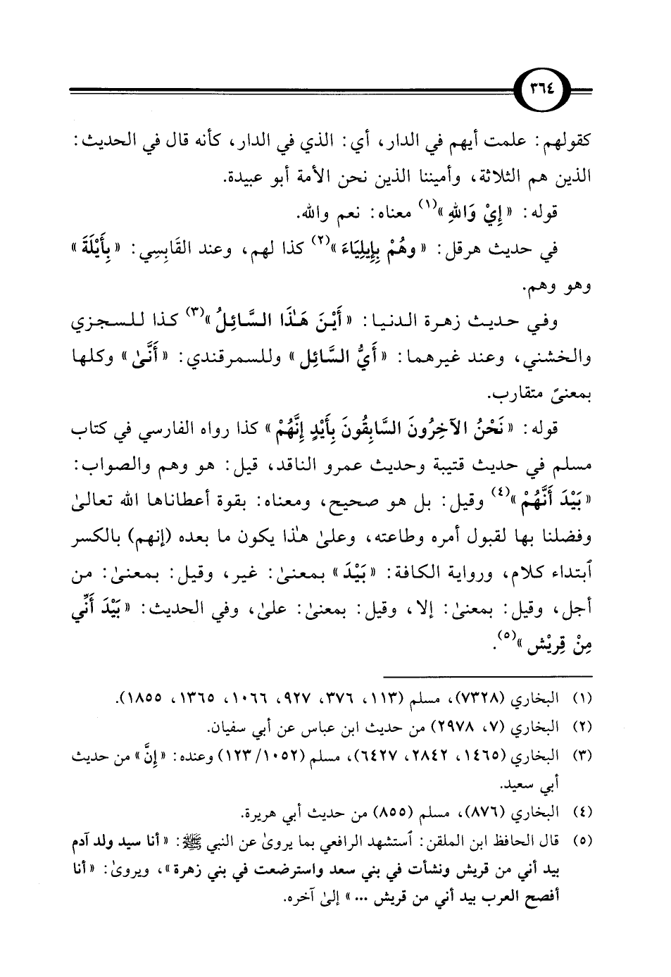 (¬5) قال الحافظ ابن الملقن: استشهد الرافعي بما يروى عن النبي - صلى الله عليه وسلم -: "أنا سيد ولد آم بيد أني من قريش ونشأت في بني سعد واسترضعت في بني زهرة "، ويروى: " أنا أفصح العرب بيد أني من قريش ... " إلى آخره.