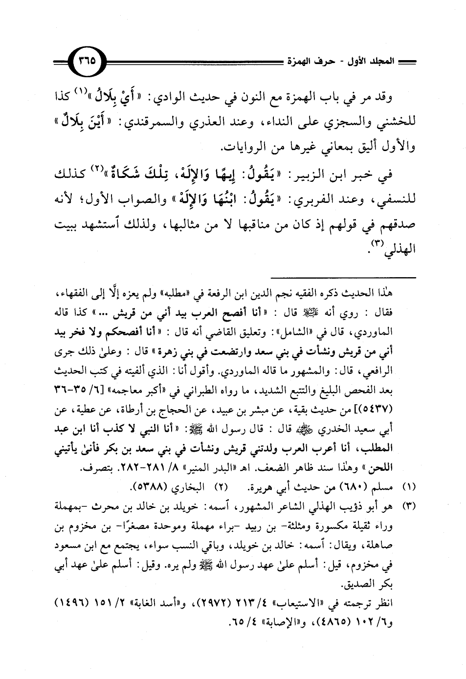 (¬3) هو أبو ذؤيب الهذلي الشاعر المشهور، اسمه: خويلد بن خالد بن محرث - بمهملة وراء ثقيلة مكسورة ومثلثة - بن ربيد - براء مهملة وموحدة مصغرًا - بن مخزوم بن صاهلة، ويقال: اسمه: خالد بن خويلد، وباقي النسب سواء، يجتمع مع ابن مسعود في مخزوم، قيل: أسلم على عهد رسول الله - صلى الله عليه وسلم - ولم يره. وقيل: أسلم على عهد أبي بكر الصديق. انظر ترجمته في "الاستيعاب" 4/ 213 (2972)، و"أسد الغابة" 2/ 151 (1496) و 6/ 102 (4865)، و"الإصابة" 4/ 65.