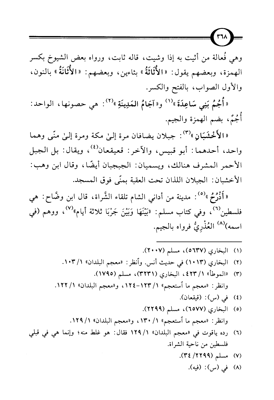 "أَذْرُحُ" (¬5): مدينة من أداني الشام تلقاء الشَّراة، قال ابن وضَّاح: هي فلسطين (¬6)، وفي كتاب مسلم: "بَيْنَهَا وَبَيْنَ جَرْبَا ثلاثة أيام" (¬7)، ووهم (في اسمه) (¬8) العُذْرِيُّ فرواه بالجيم.