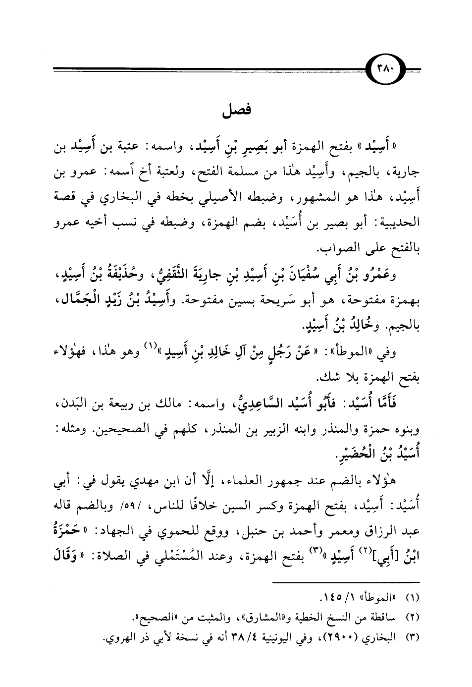 فَأَمَّا أُسَيْد: فأَبُو أُسَيْد السَّاعِدِيُّ، واسمه: مالك بن ربيعة بن البَدن، وبنوه حمزة والمنذر وابنه الزبير بن المنذر، كلهم في الصحيحين. ومثله: أُسَيْدُ بْنُ الْحُضَيْرِ.