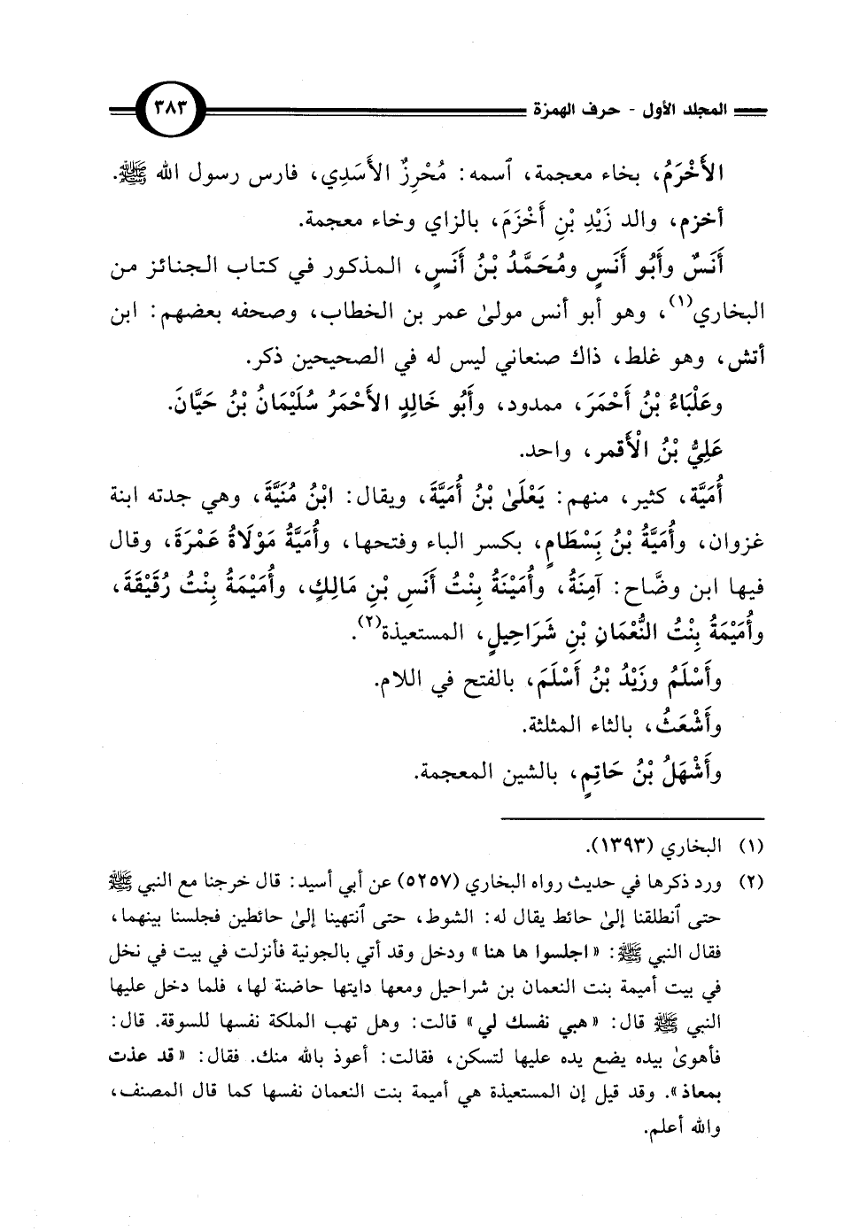 أُمَيَّة، كثير، منهم: يَعْلَى بْنُ أُمَيَّةَ، ويقال: ابْنُ مُنَيَّةَ، وهي جدته ابنة غزوان، وأُمَيَّةُ بْنُ بَسْطَامٍ، بكسر الباء وفتحها، وأُمَيَّةُ مَوْلَاةُ عَمْرَةَ، وقال فيها ابن وضَّاح: آمِنَةُ، وأُمَيْنَةُ بِنْتُ أَنَسِ بْنِ مَالِكٍ، وأُمَيْمَةُ بِنْتُ رُقَيْقَةَ، وأُمَيْمَةُ بِنْتُ النُّعْمَان بْنِ شَرَاحِيلٍ، المستعيذة (¬2).